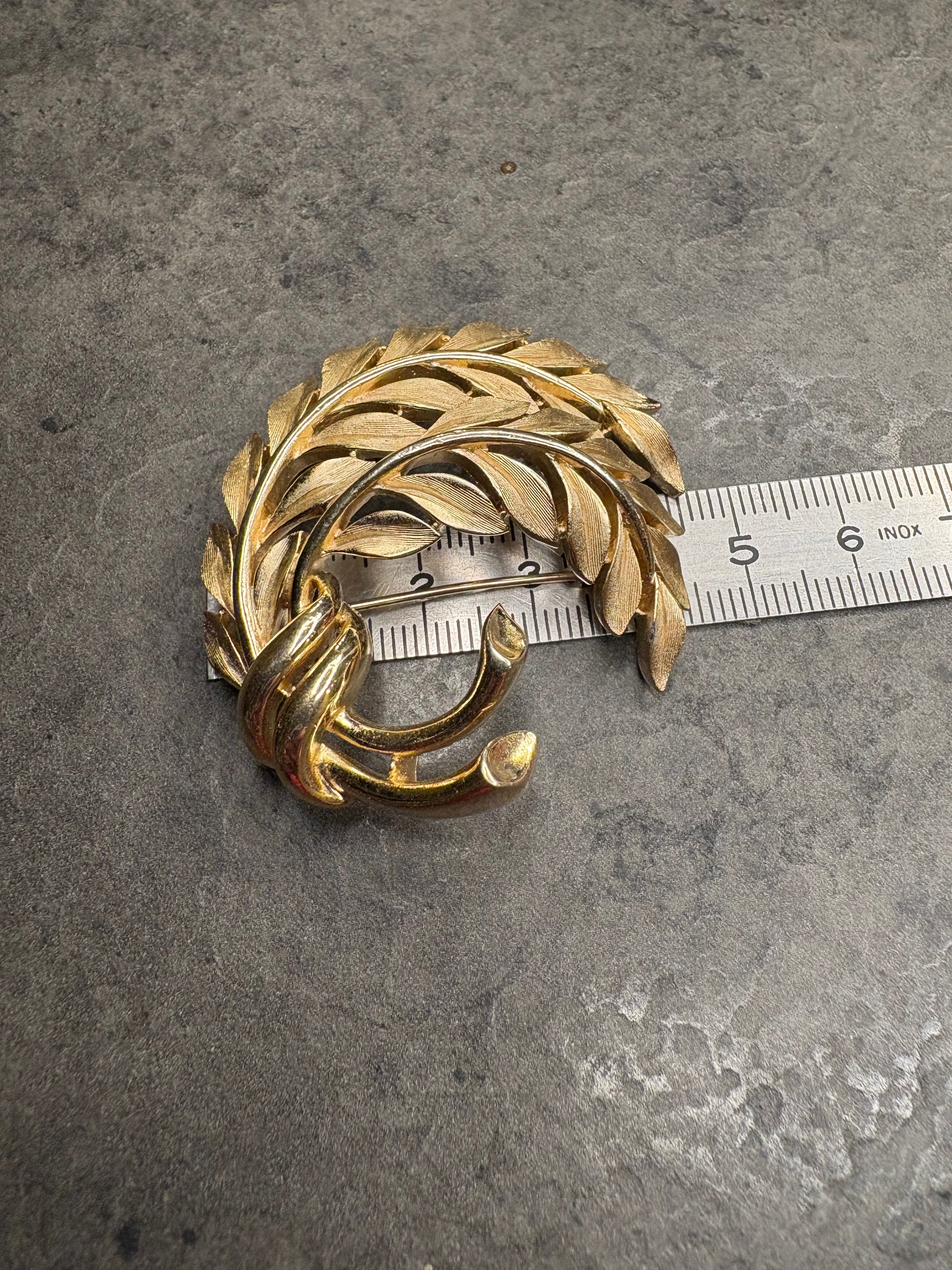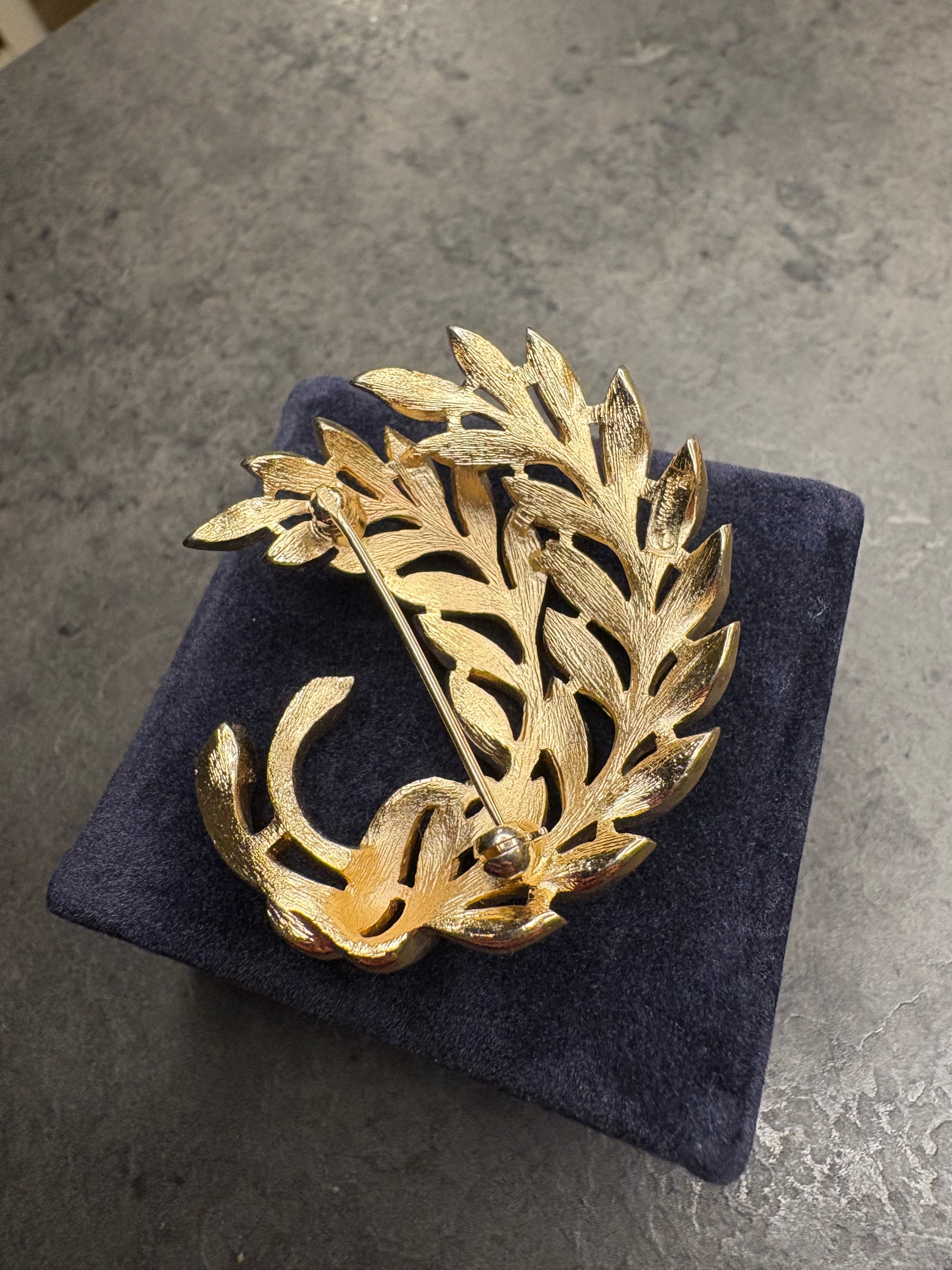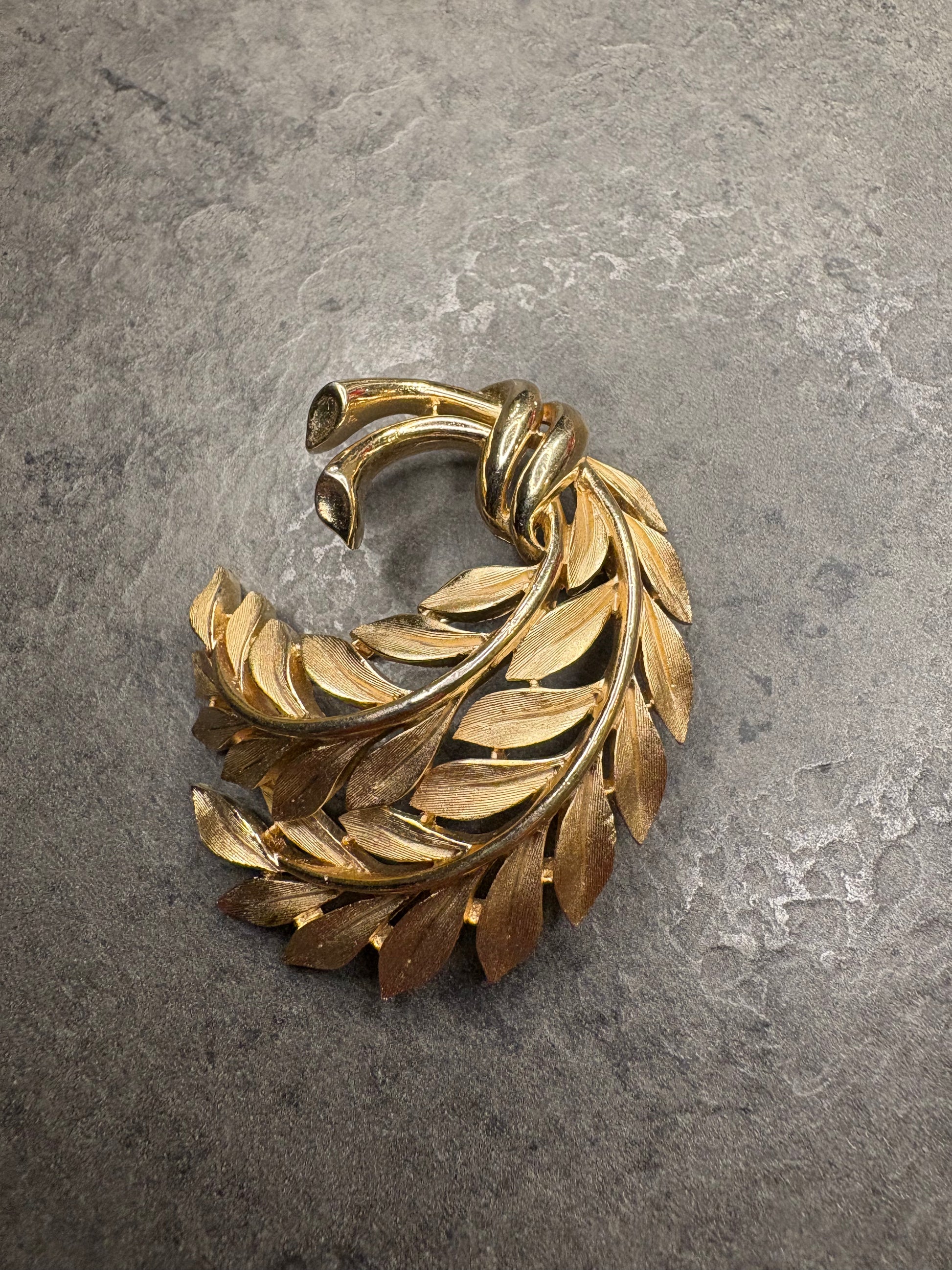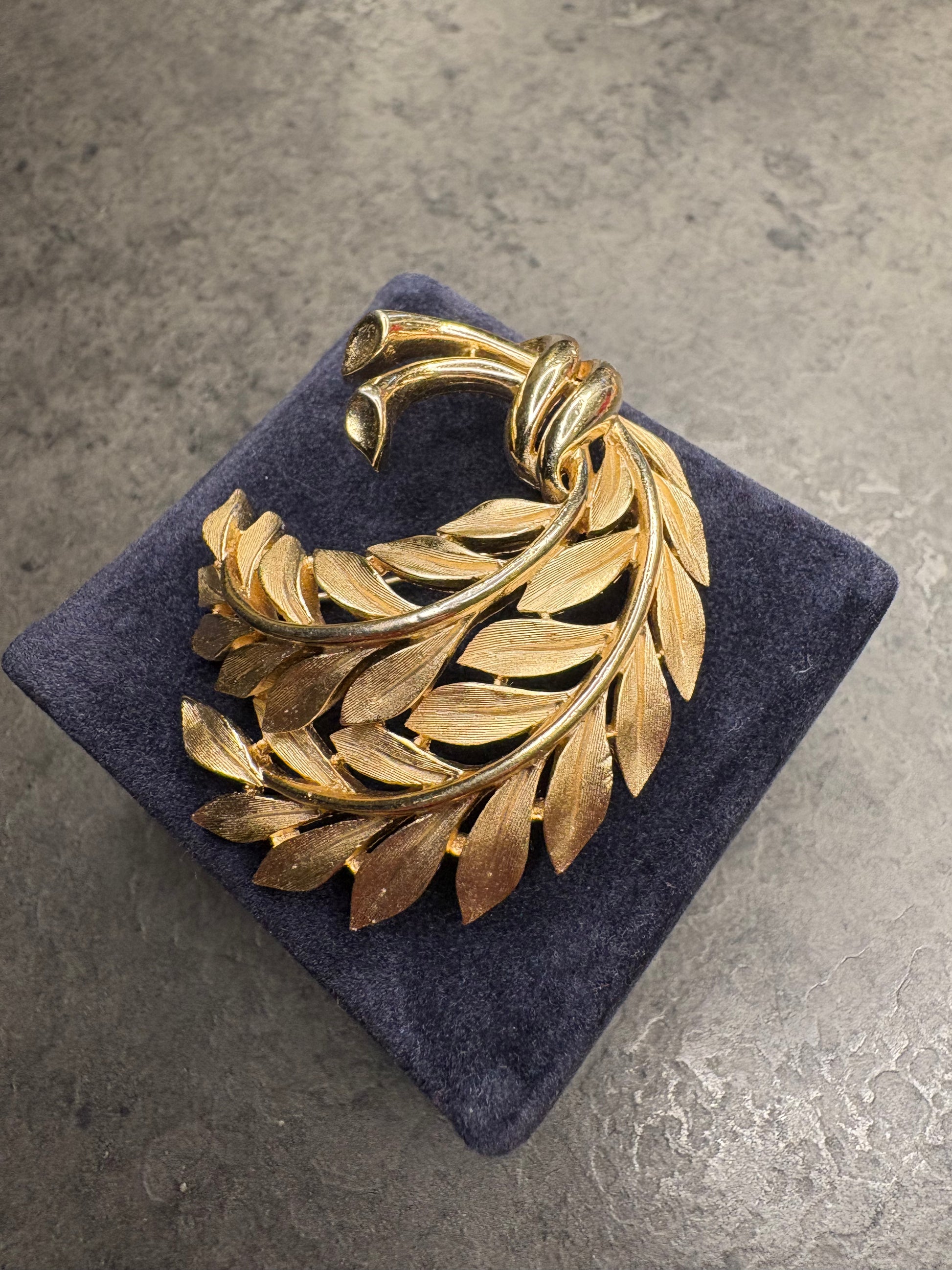 Elegante spilla vintage firmata Trifari, un gioiello dal fascino intramontabile che celebra l’armonia della natura con un design raffinato e scultoreo.