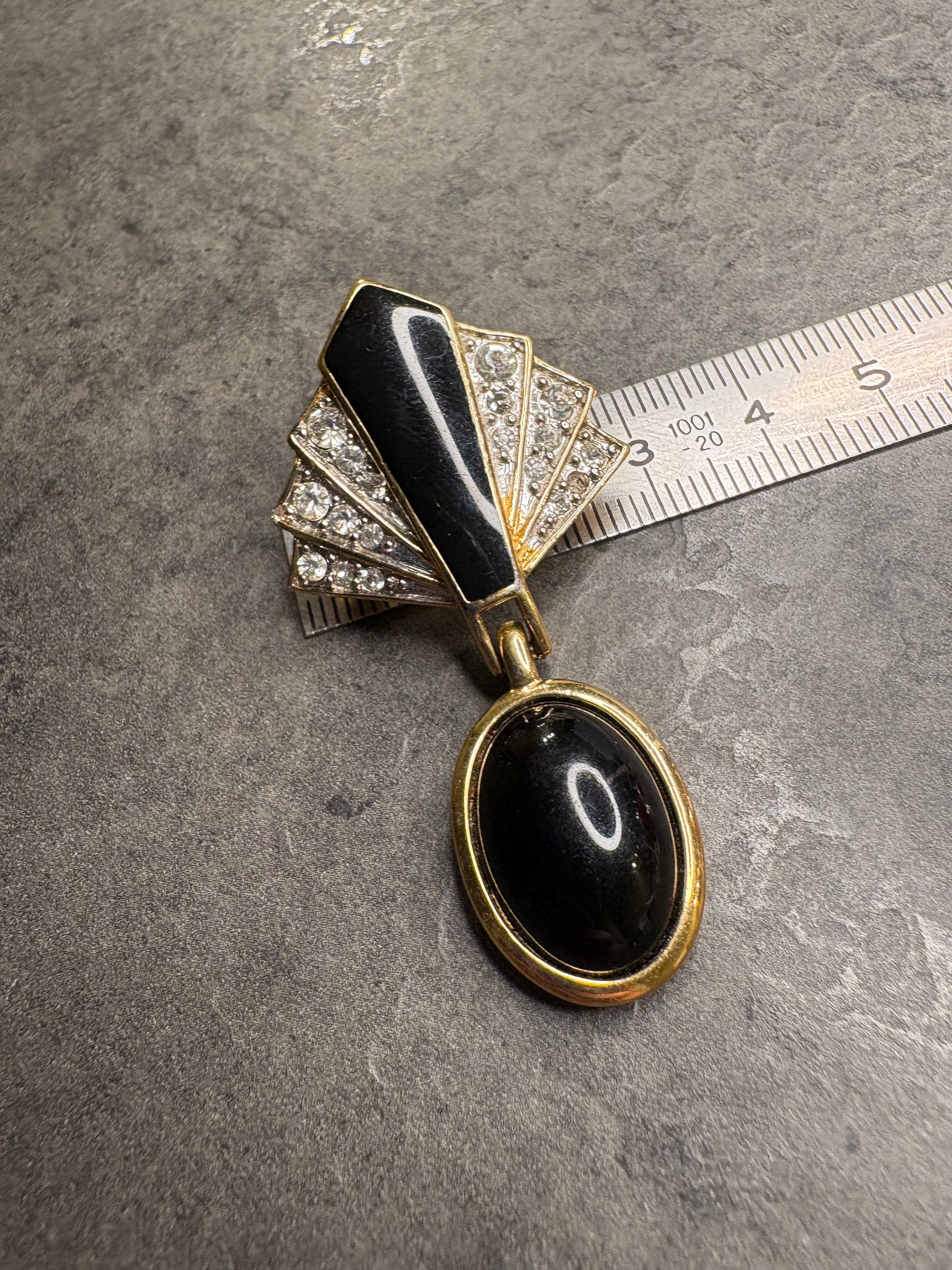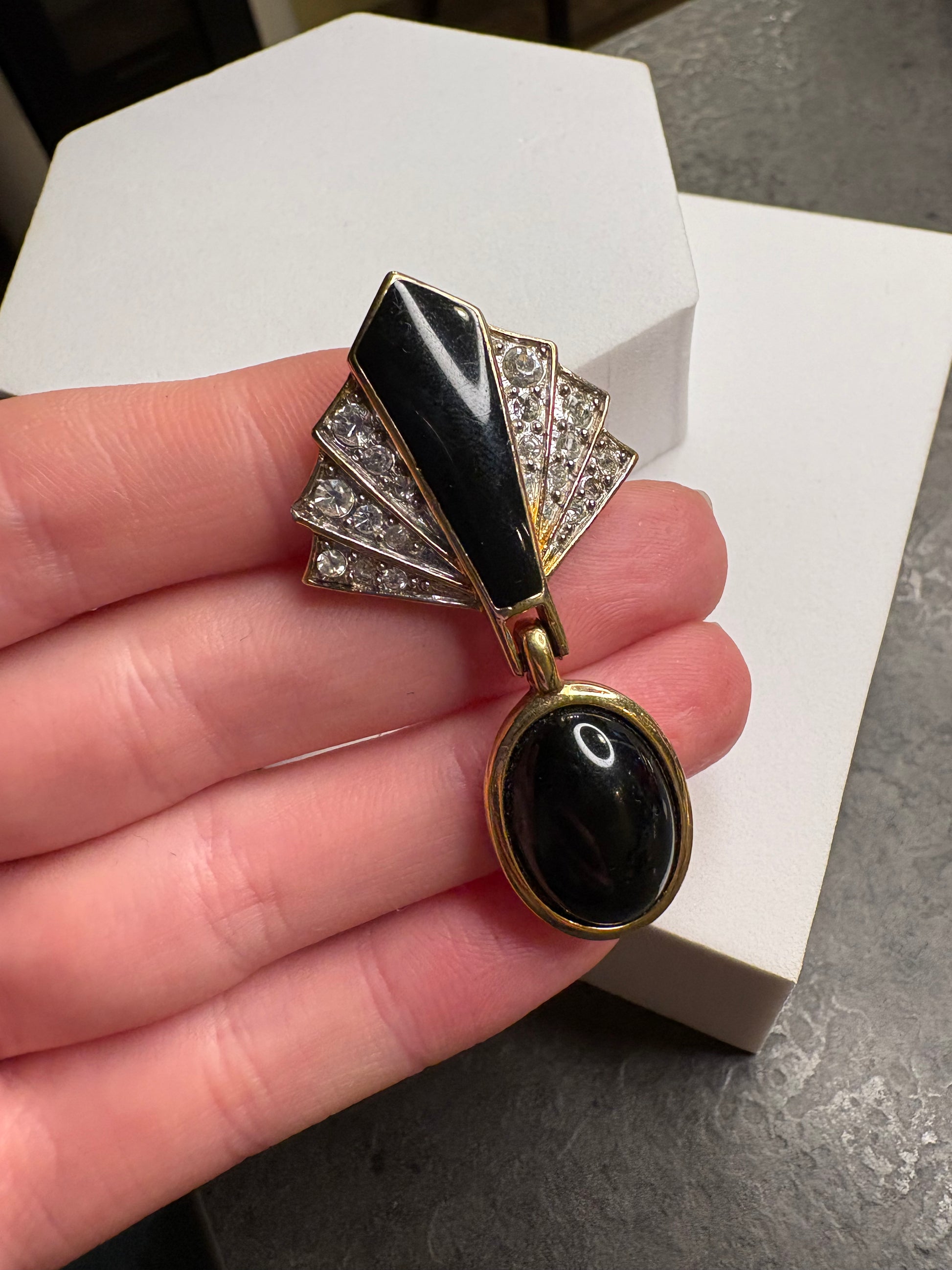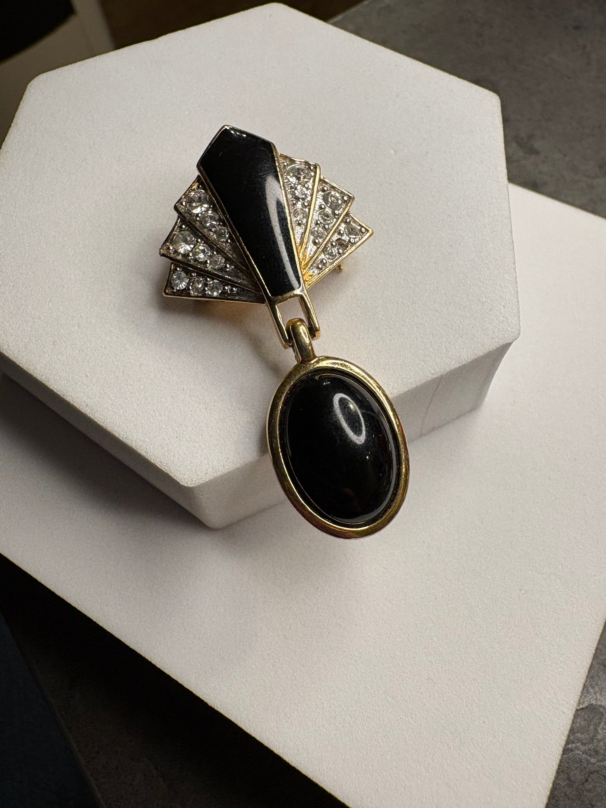 Meravigliosa spilla vintage di Trifari degli anni ’70 con elemento pendente, realizzata in metallo color oro. La parte superiore presenta smalto nero lucido impreziosito da cristalli trasparenti, che donano brillantezza e un tocco glamour. Dal corpo principale scende un pendente con cabochon nero, elemento iconico che aggiunge movimento ed eleganza. Una spilla scenografica e raffinata, tipica delle creazioni Trifari più ricercate del decennio.