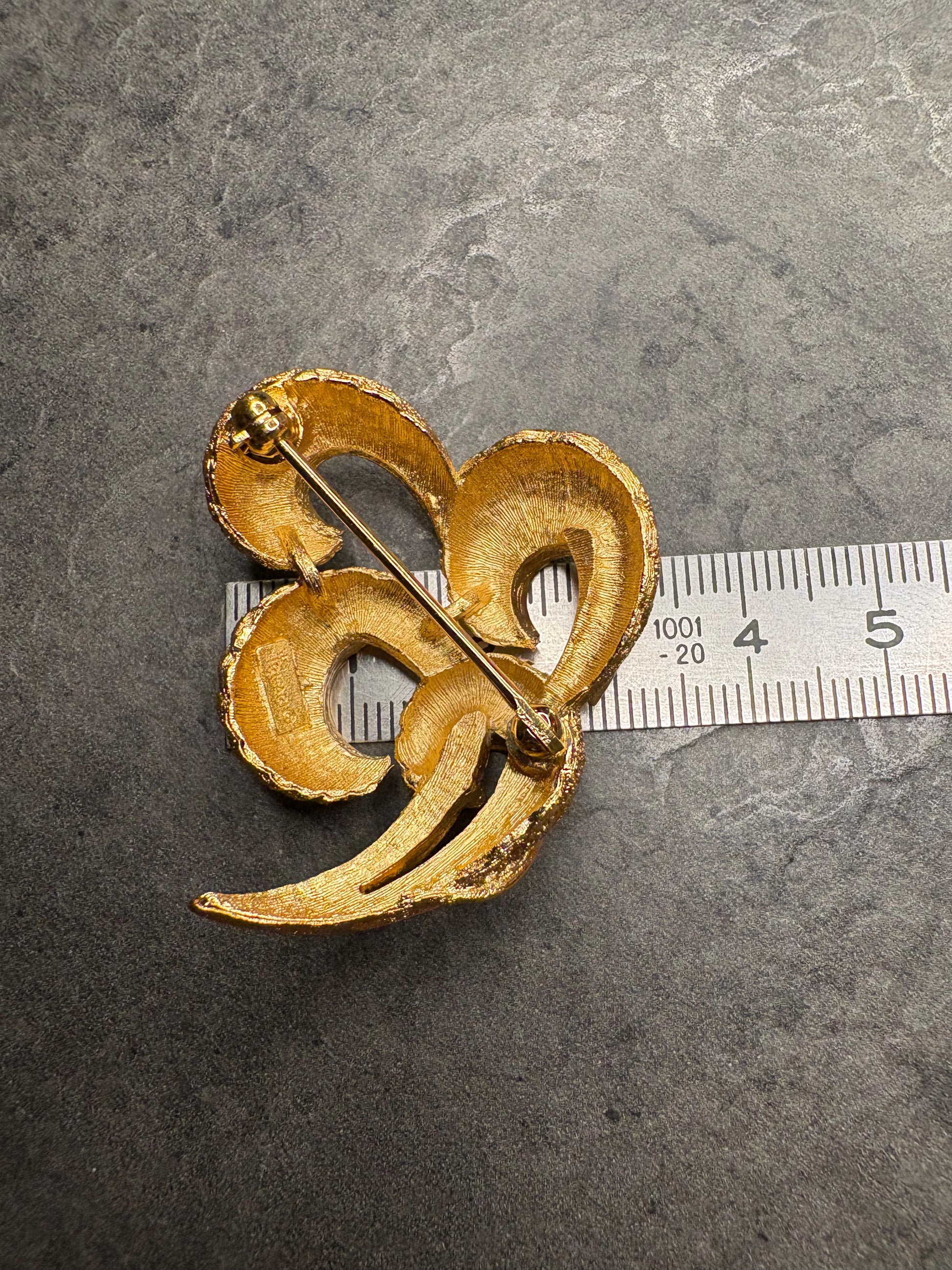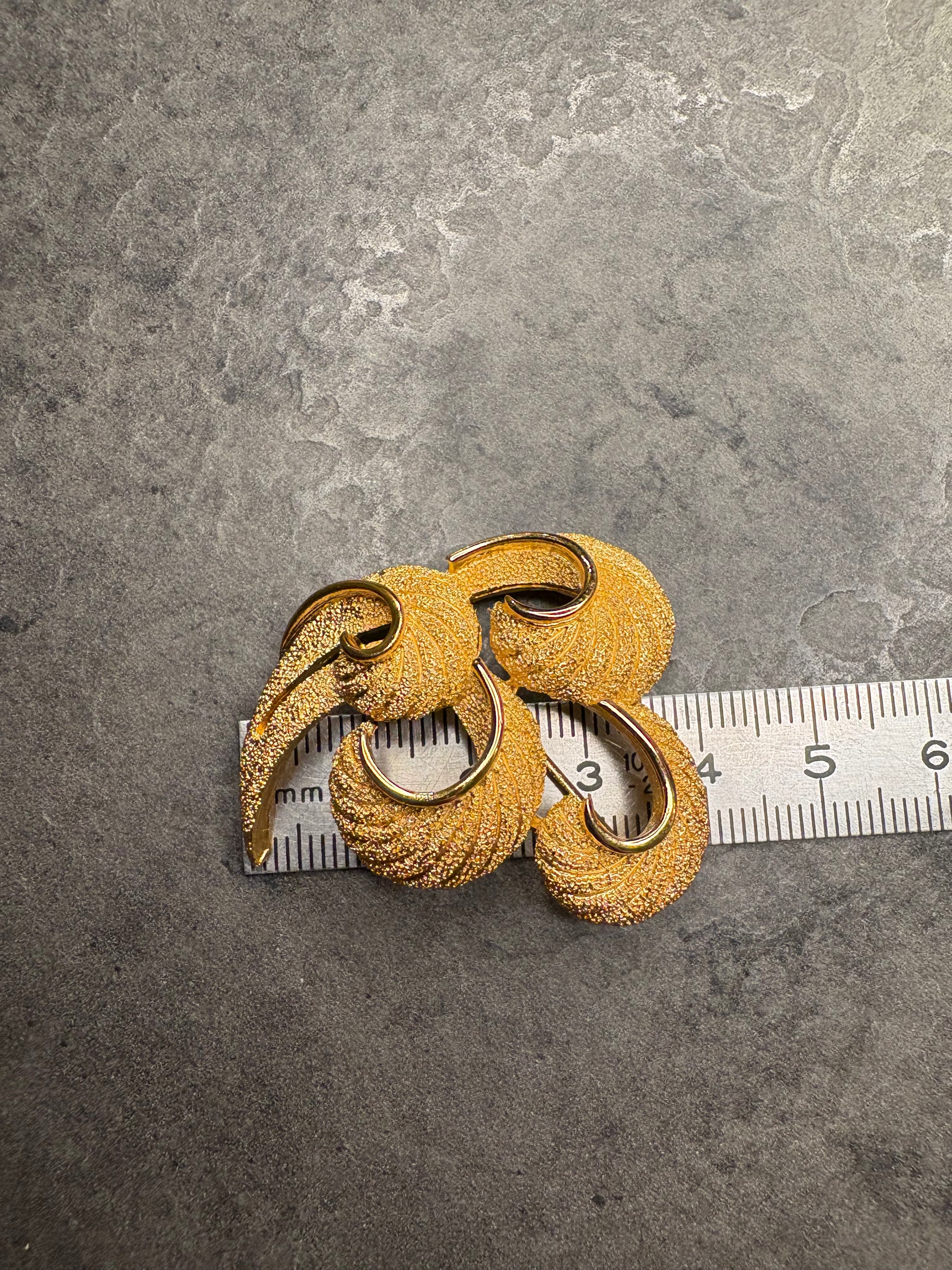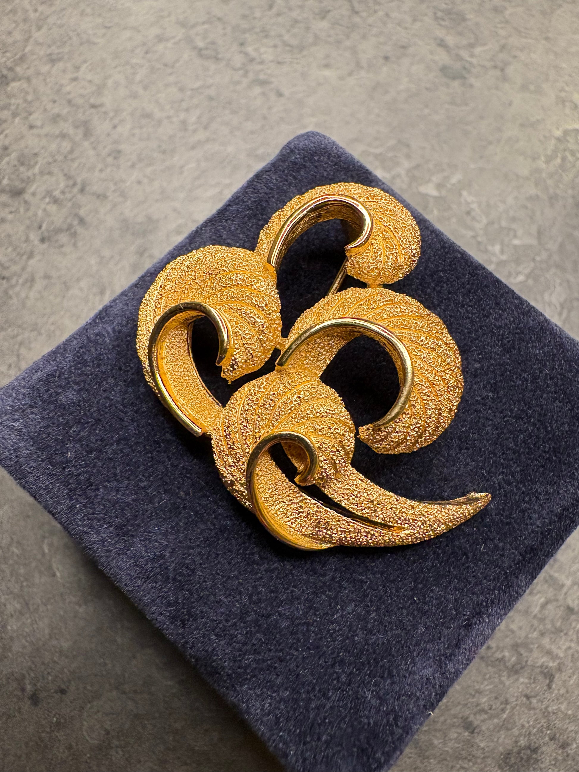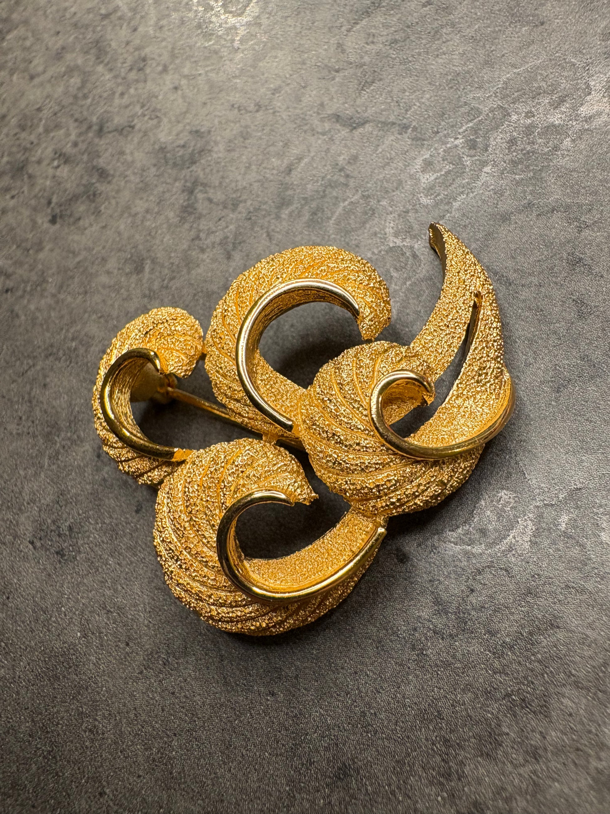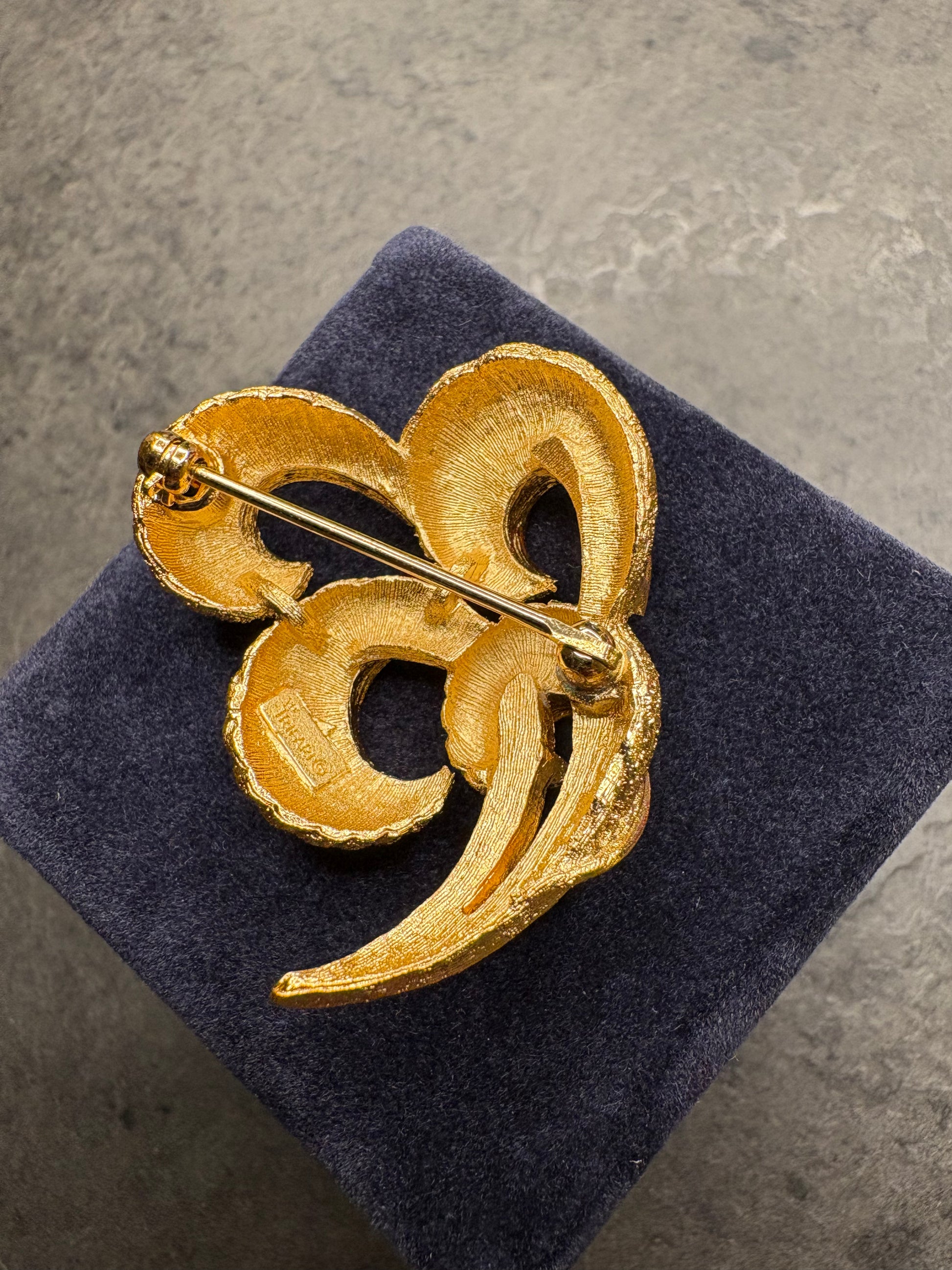 Questa spilla vintage di Trifari è un elegante esempio di bigiotteria rétro, realizzata in metallo dorato con una finitura lucida e satinata ,che esalta il suo design sofisticato. La forma ricorda le foglie stilizzate o un intreccio, con bande curve che si avvolgono su loro stesse, creando un effetto fluido e dinamico che dà l’impressione di movimento. Le bande hanno una texture rigata, che aggiunge profondità e un tocco di raffinatezza al pezzo, mentre le estremità si allargano leggermente, conferendo un aspetto organico e naturale.