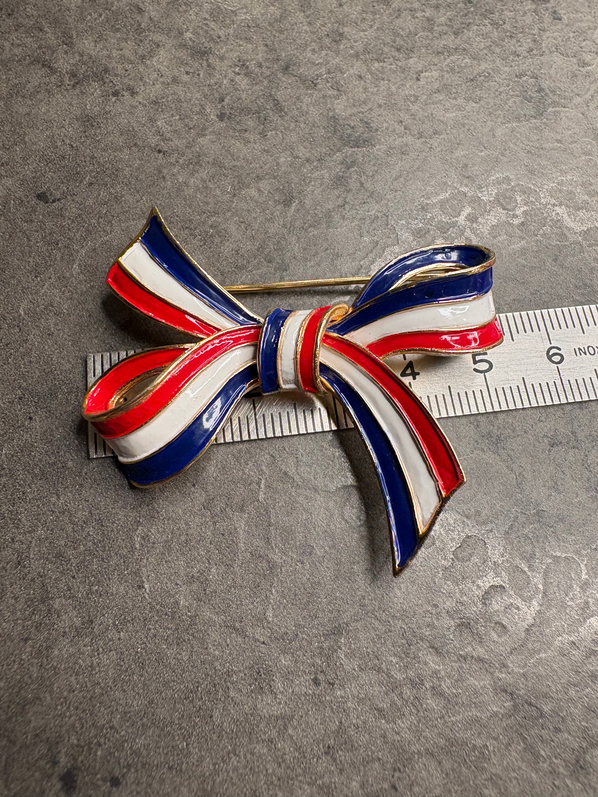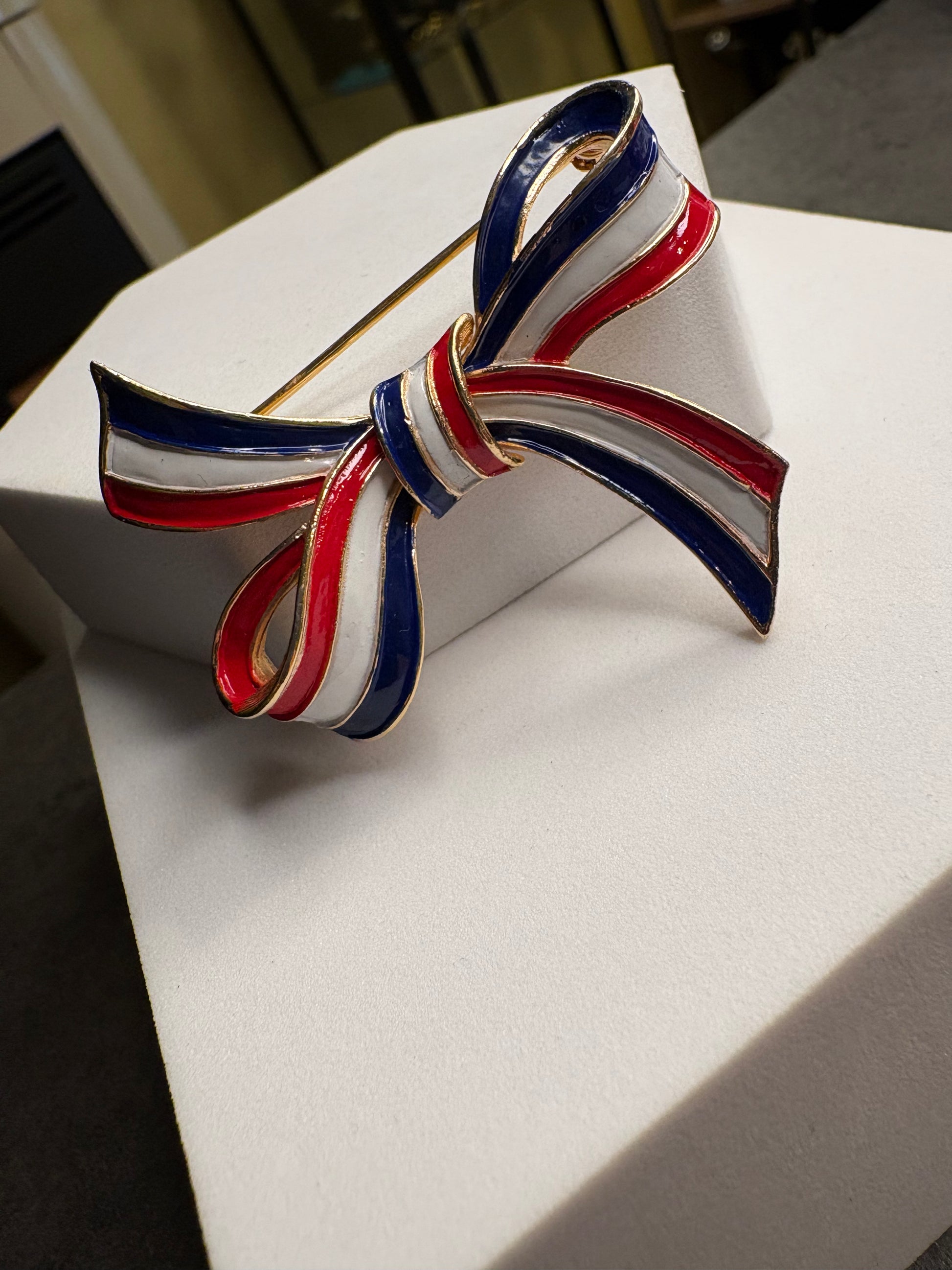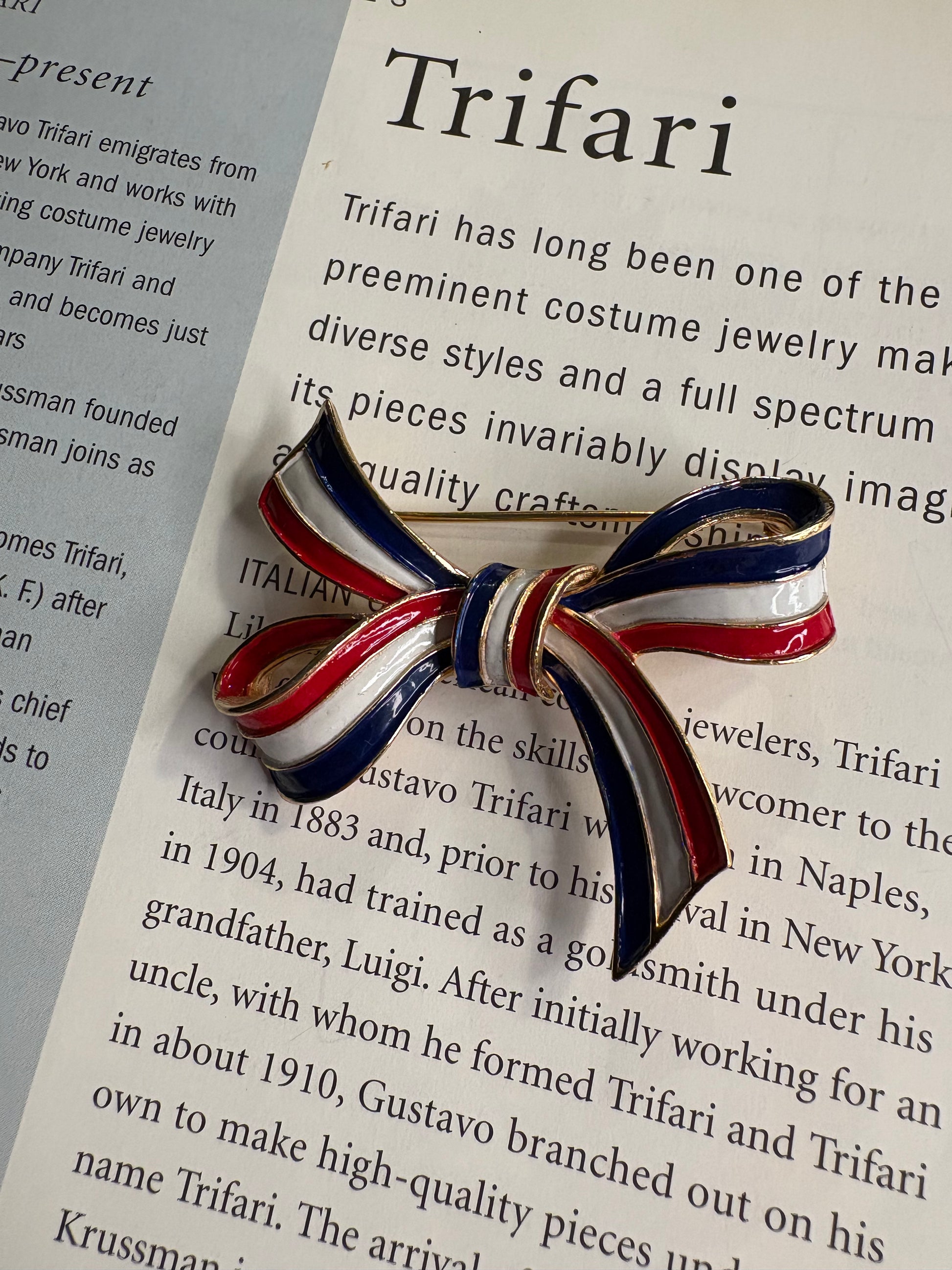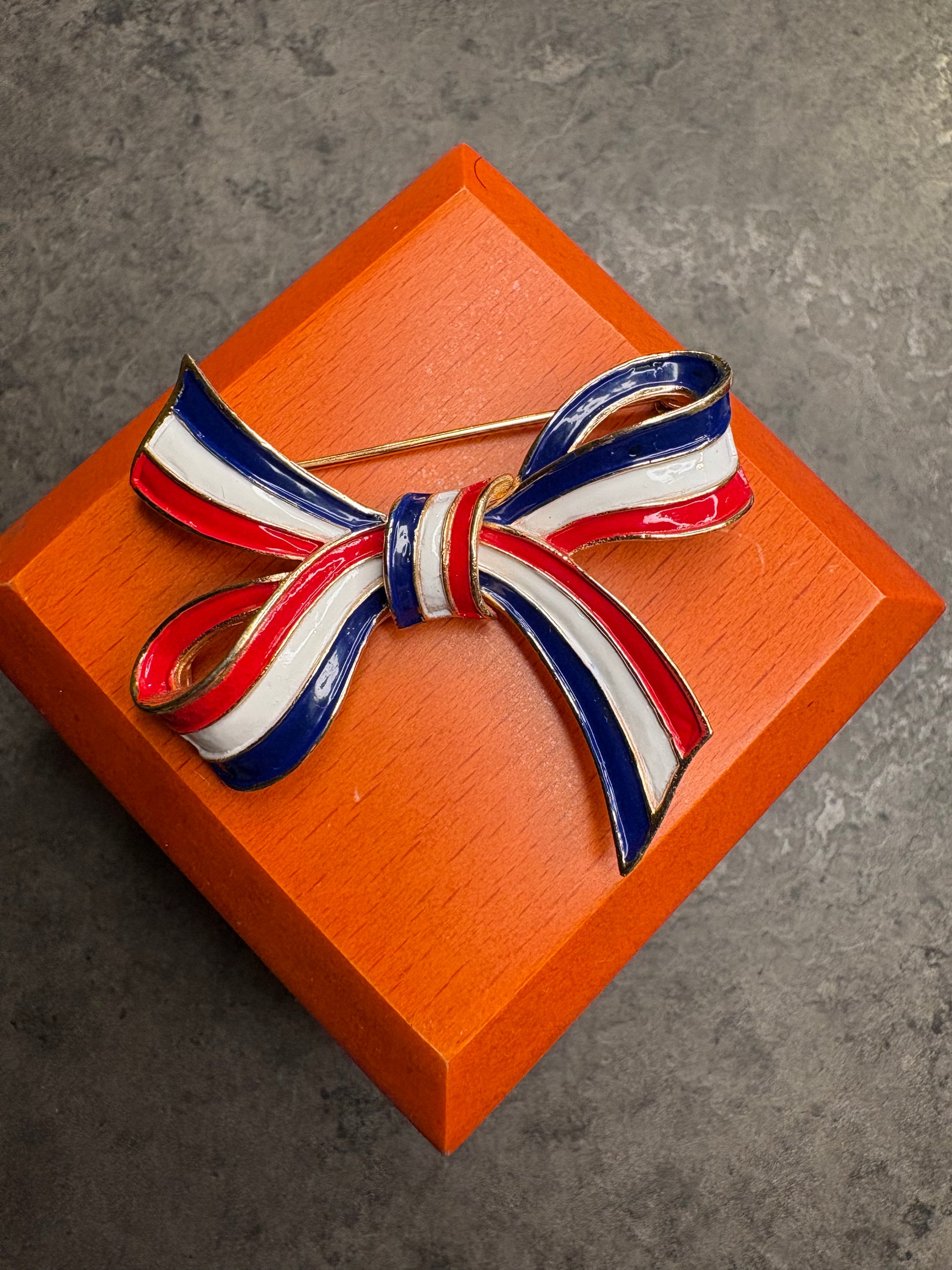 Meravigliosa spilla a forma di fiocco firmata Trifari, realizzata in metallo dorato satinato e smalto nei colori blu, bianco e rosso. Il fiocco è elegante e ben definito, con nastri curvi che creano movimento e leggerezza. Lo smalto lucido contrasta splendidamente con la finitura satinata del metallo, esaltando l’iconico design patriottico e sofisticato tipico del brand.
