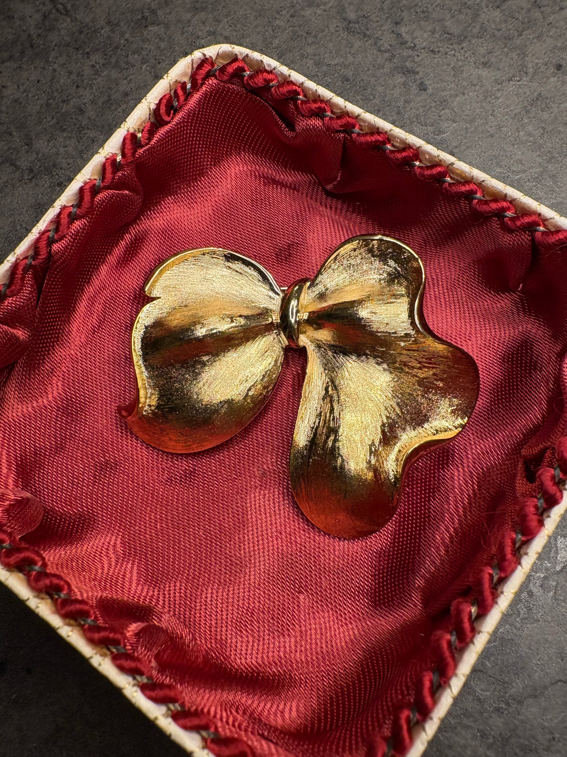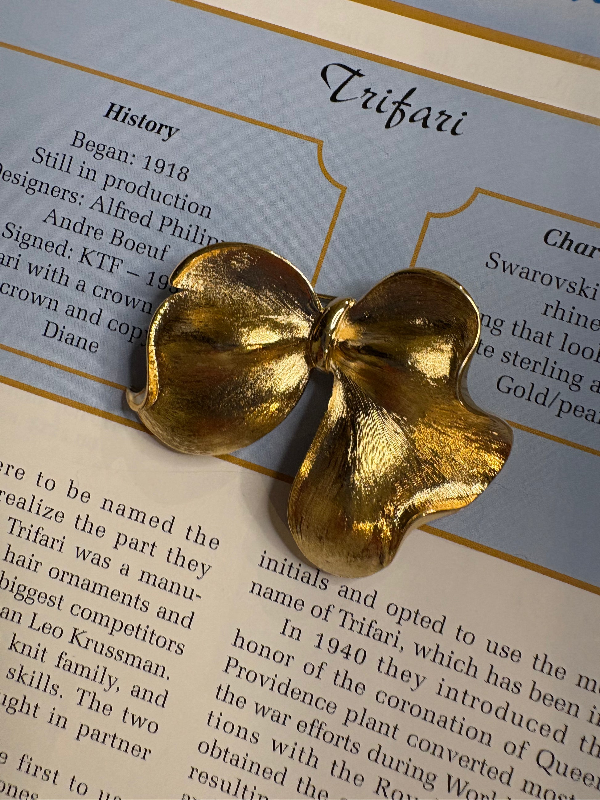 Il design, sinuoso e tridimensionale, rappresenta un fiocco stilizzato dalle linee morbide e avvolgenti, un tema molto amato nelle collezioni Trifari del periodo, simbolo di grazia e femminilità. La lavorazione a rilievo mette in risalto il contrasto tra le parti lucide e quelle leggermente spazzolate, creando un effetto di movimento elegante e moderno.