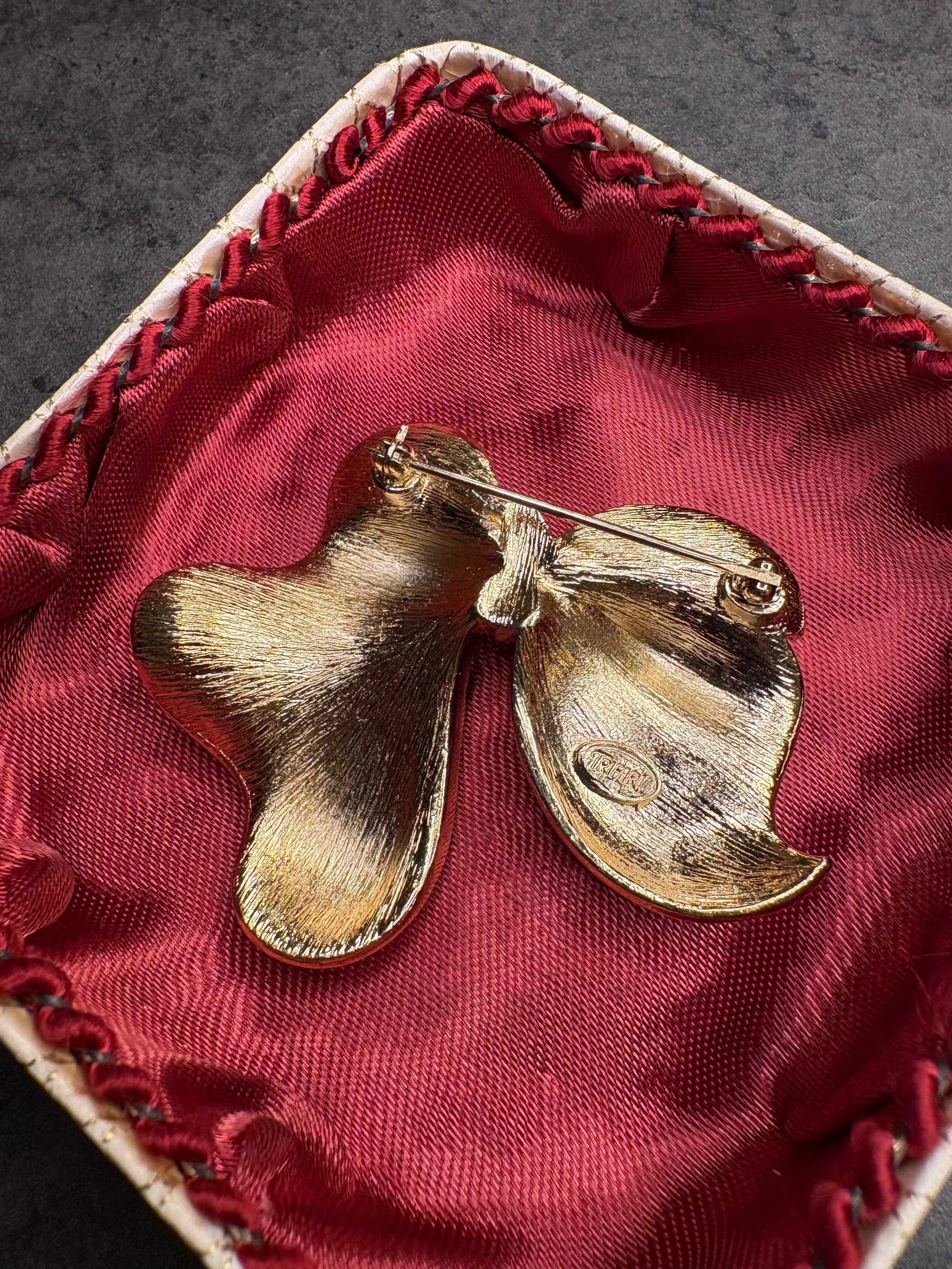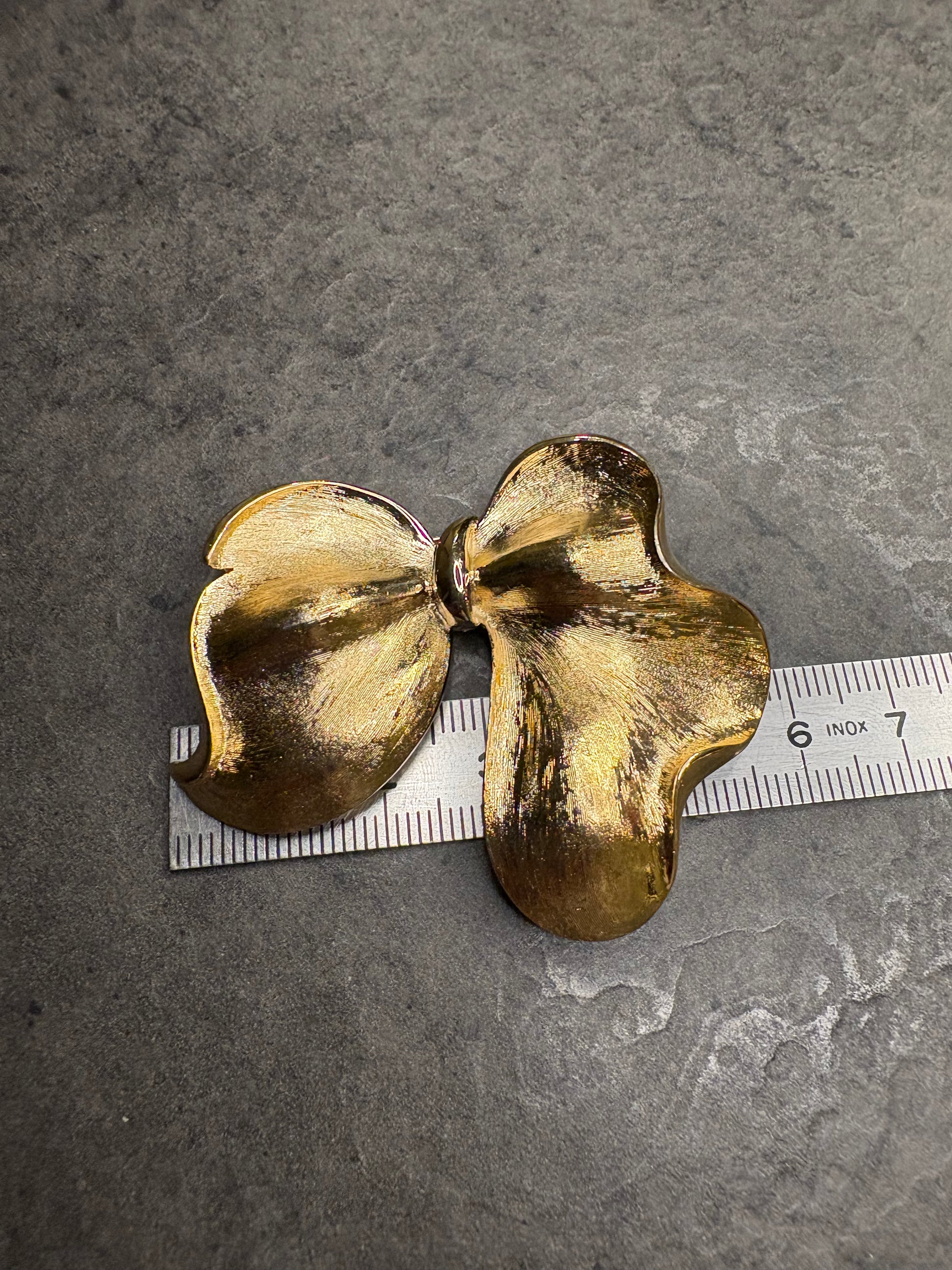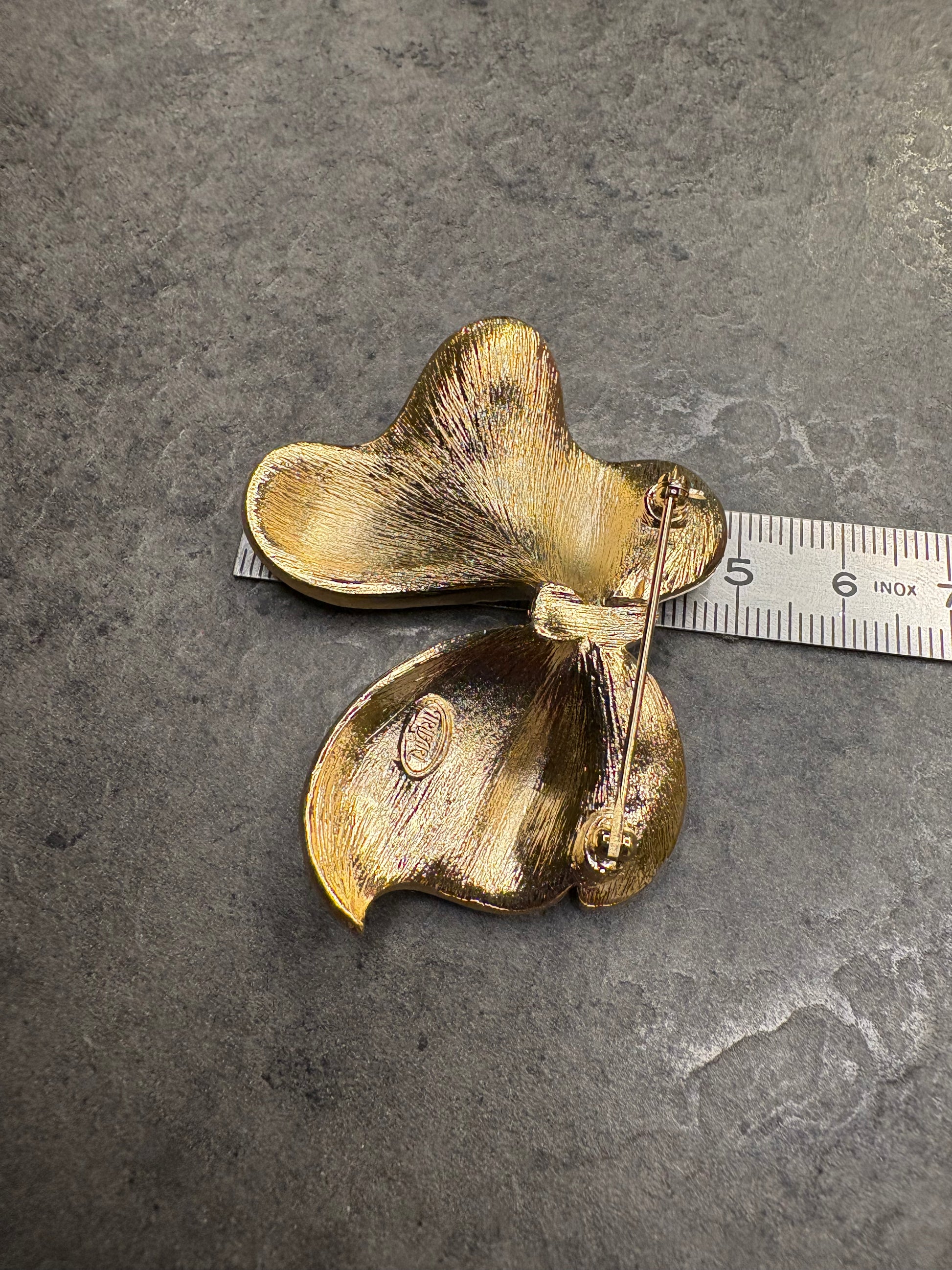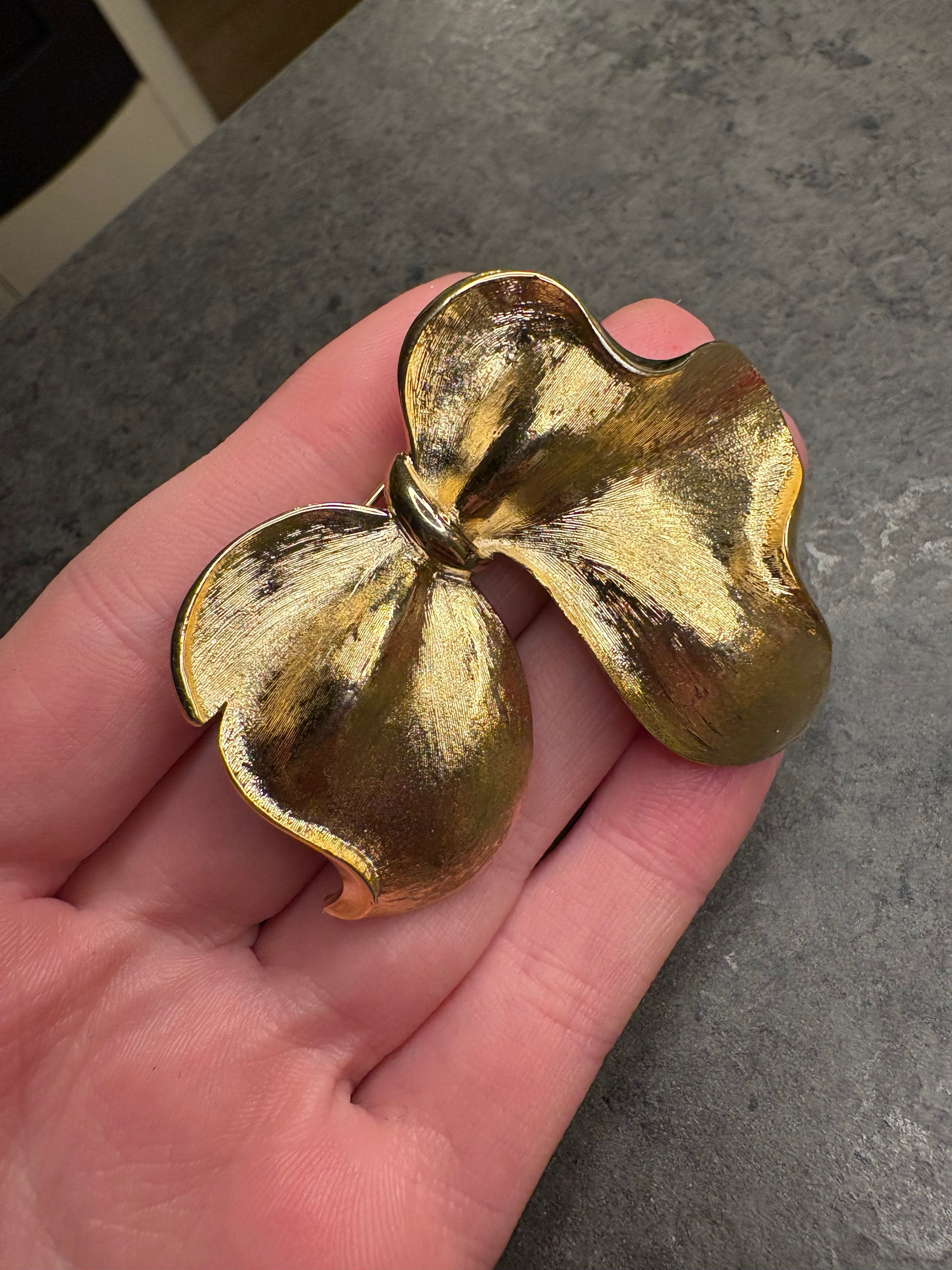 Elegante spilla vintage Trifari risalente agli anni ’70, realizzata in metallo dorato con una splendida finitura satinata effetto seta che riflette la luce con delicata raffinatezza.