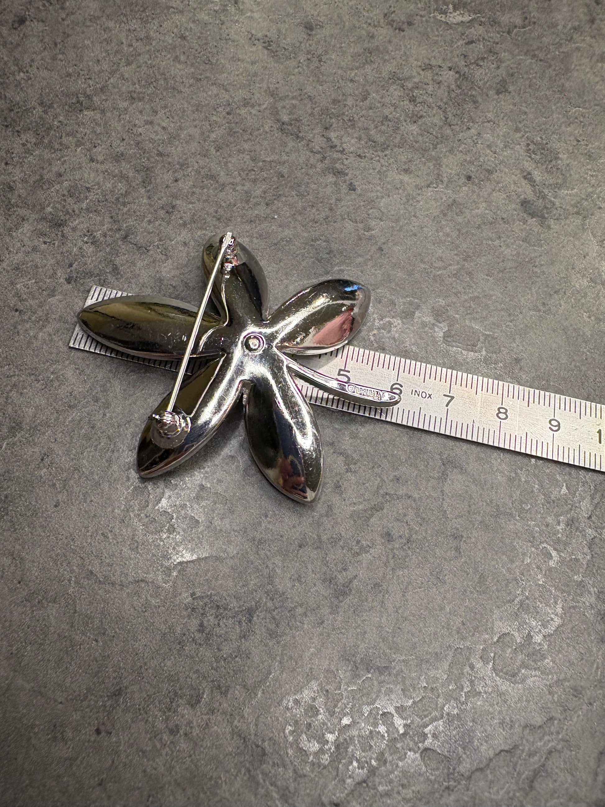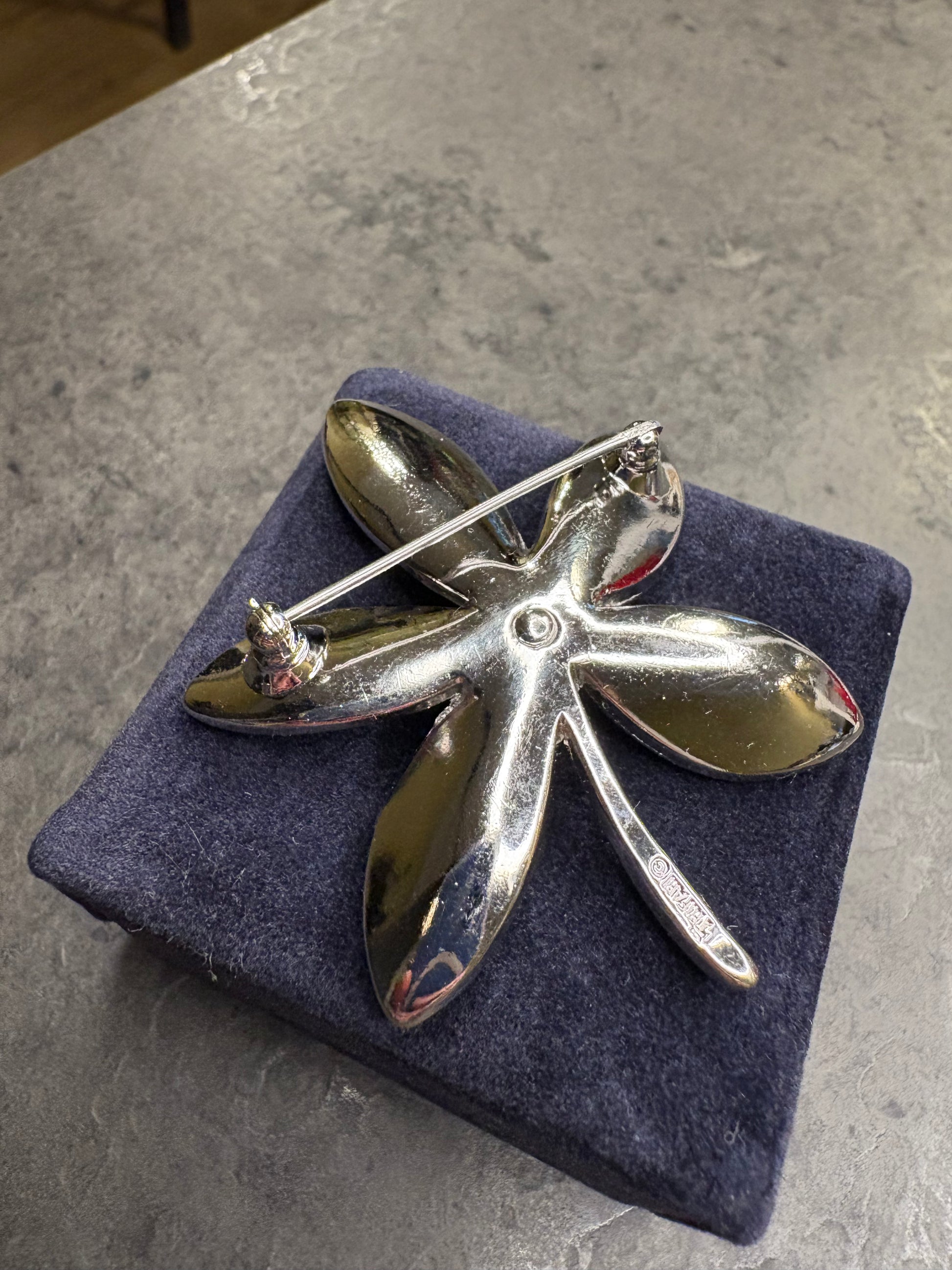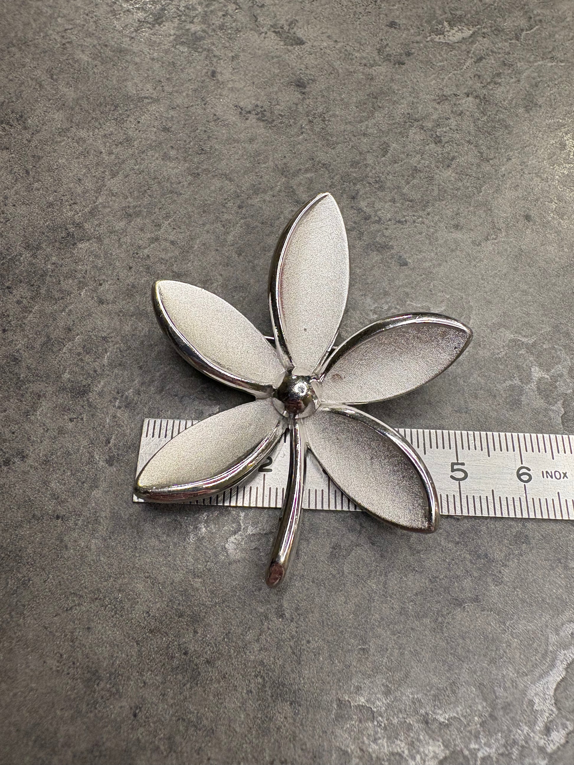 Magnifica spilla vintage firmata Trifari, un esempio perfetto dell’eleganza scultorea e del design essenziale che hanno reso celebre la maison americana negli anni ’60. Realizzata in metallo argentato lucente, rappresenta un grande fiore stilizzato a cinque petali, dalle linee sinuose e moderne. I petali alternano superfici satinate e bordi lucidi, creando un raffinato contrasto di texture e luminosità, tipico delle creazioni Trifari del periodo.