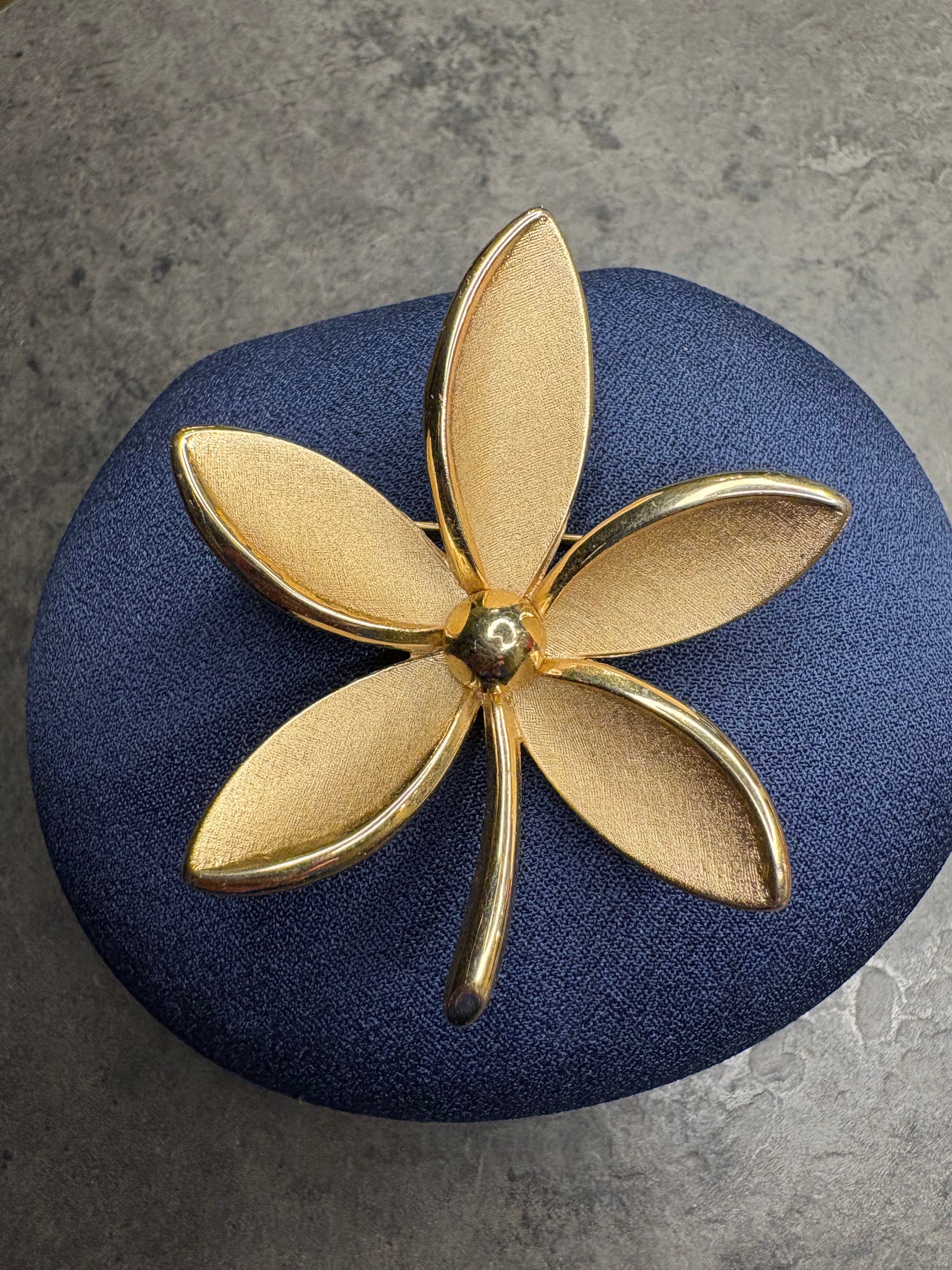 Realizzata in metallo dorato satinato, raffigura un fiore stilizzato a cinque petali, dalle linee pulite e armoniose. I petali alternano una superficie opaca finemente incisa a bordi lucidi e levigati, creando un contrasto di texture che dona profondità e luminosità al pezzo.