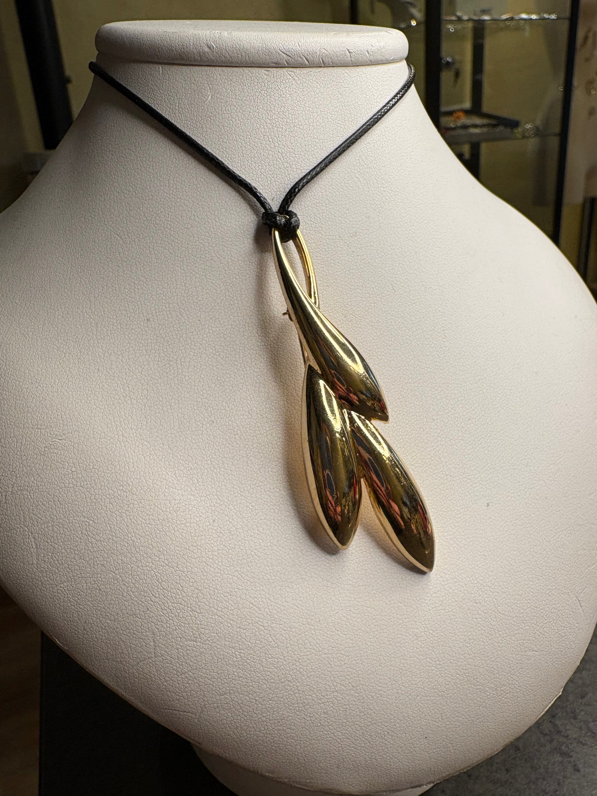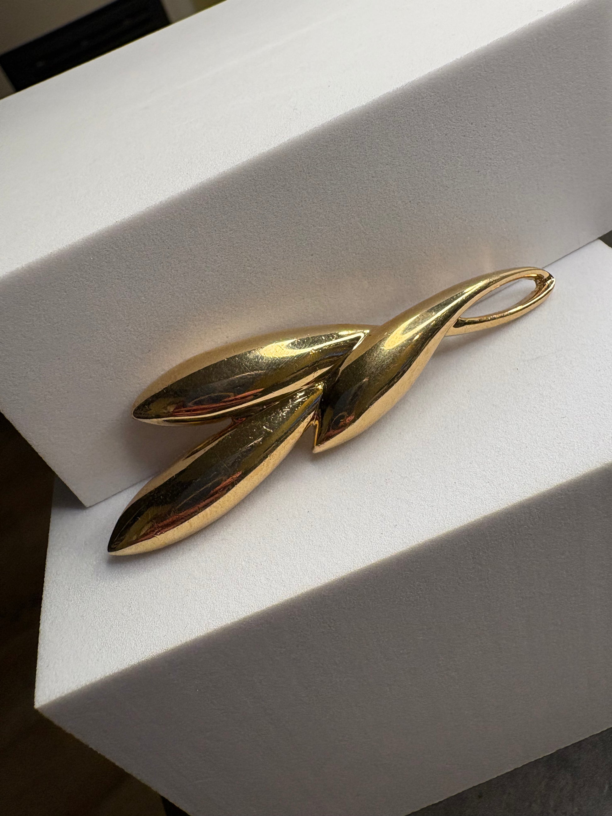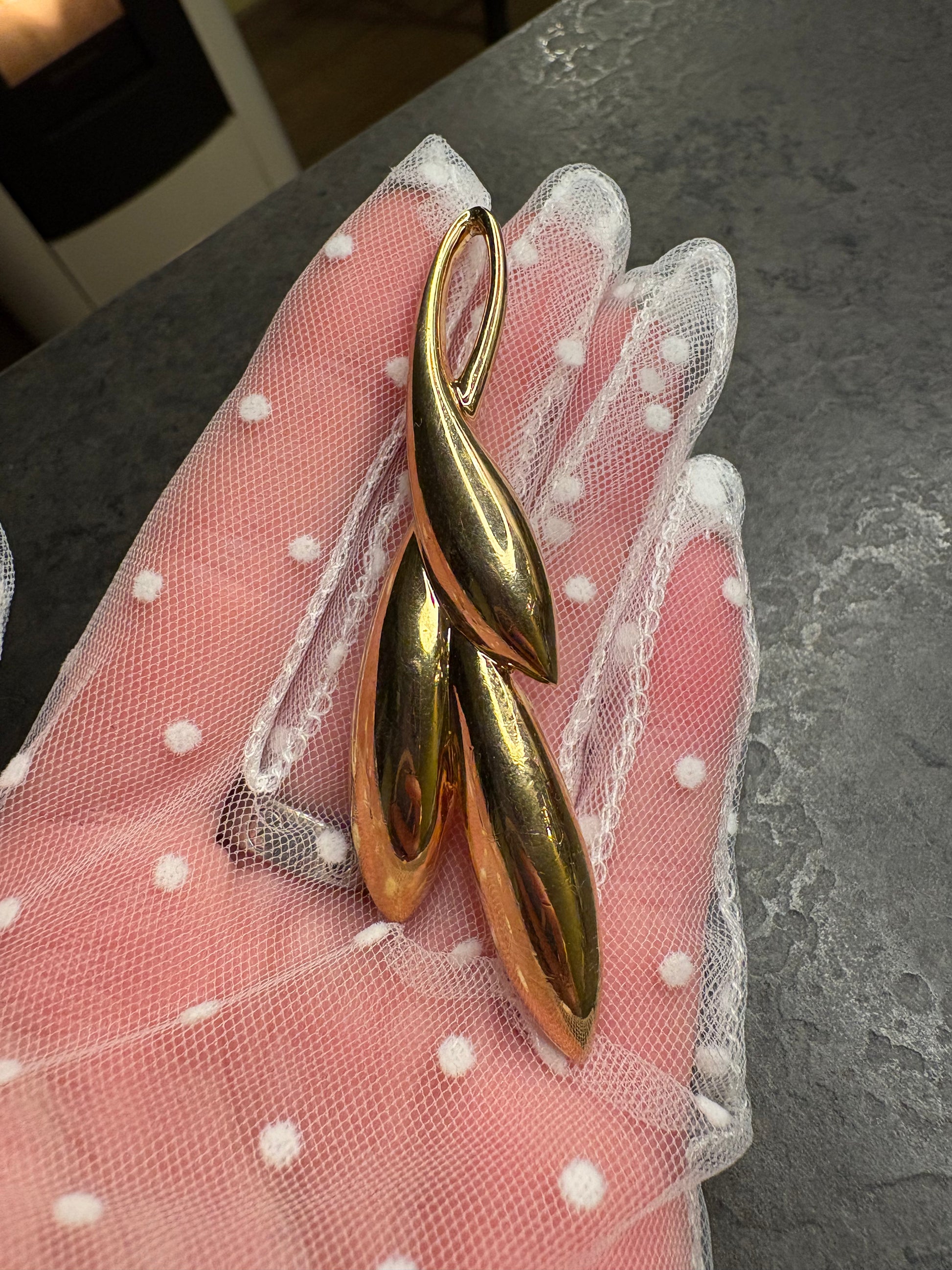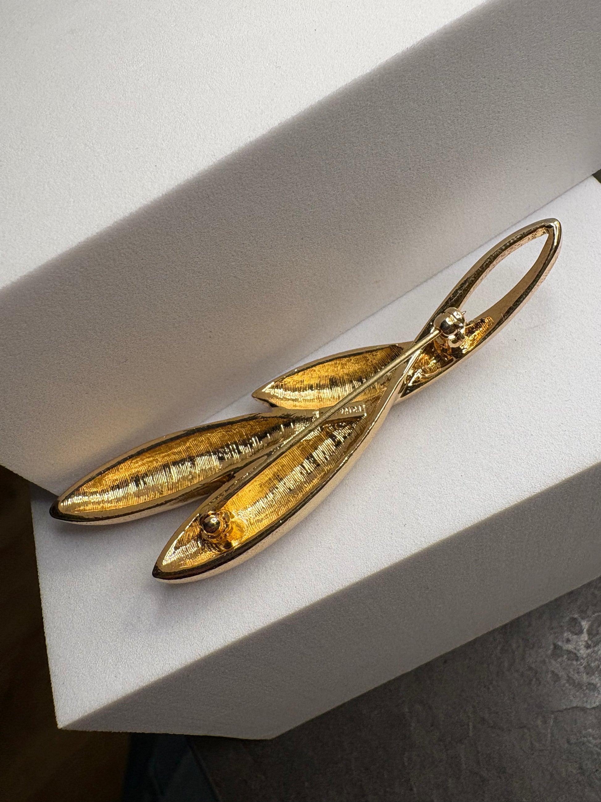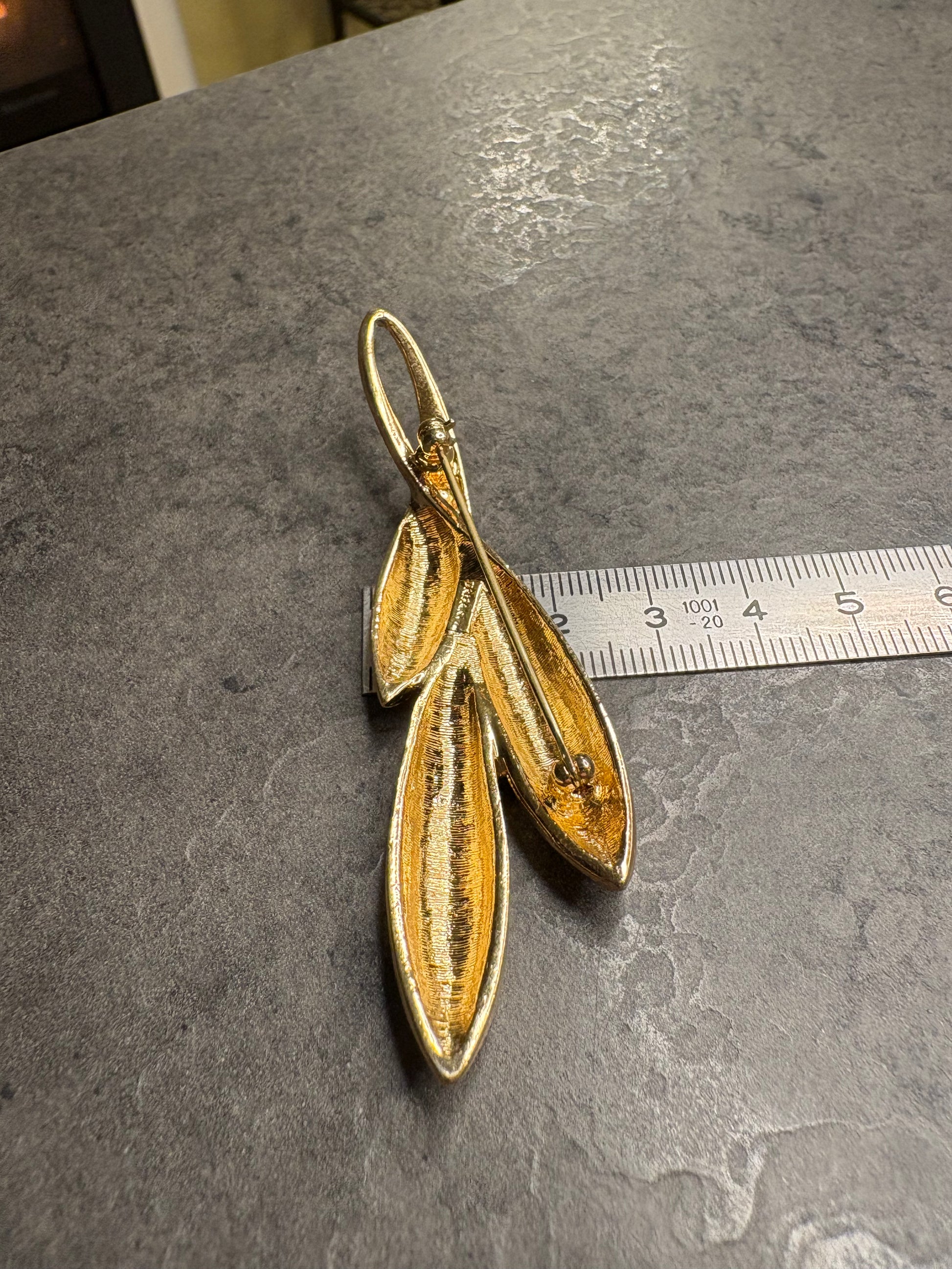 Raffinata spilla allungata firmata Trifari TM, composta da tre elementi bombati e affusolati in metallo dorato lucido che si sovrappongono con eleganza creando movimento e riflessi caldi, struttura solida con chiusura funzionante, perfetta su giacche e cappotti, volendo si può usare anche come elegante pendente.