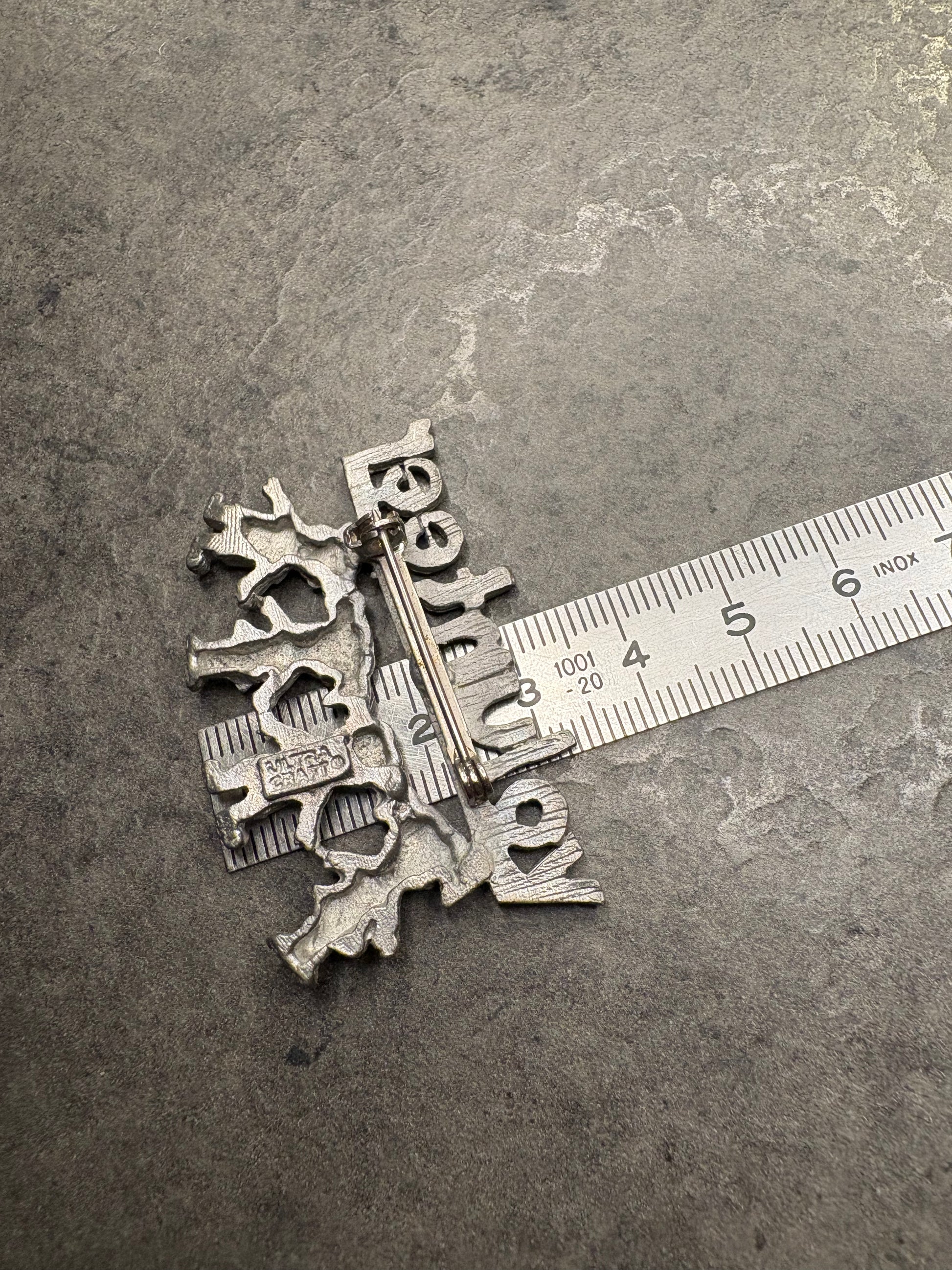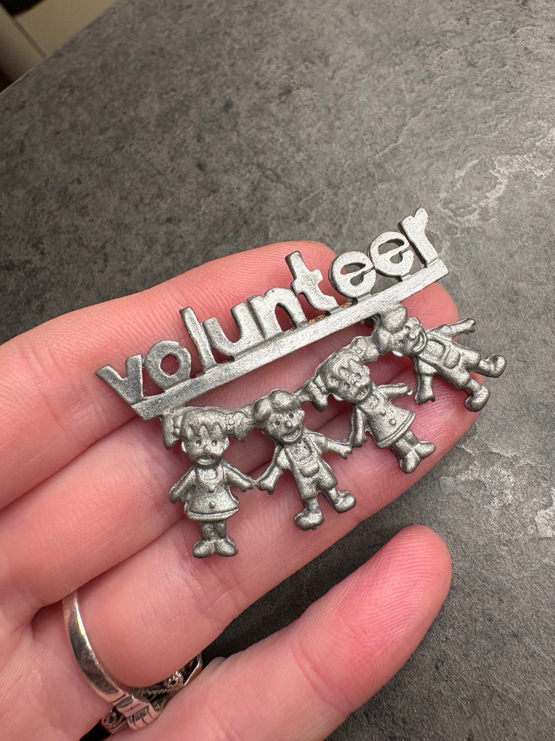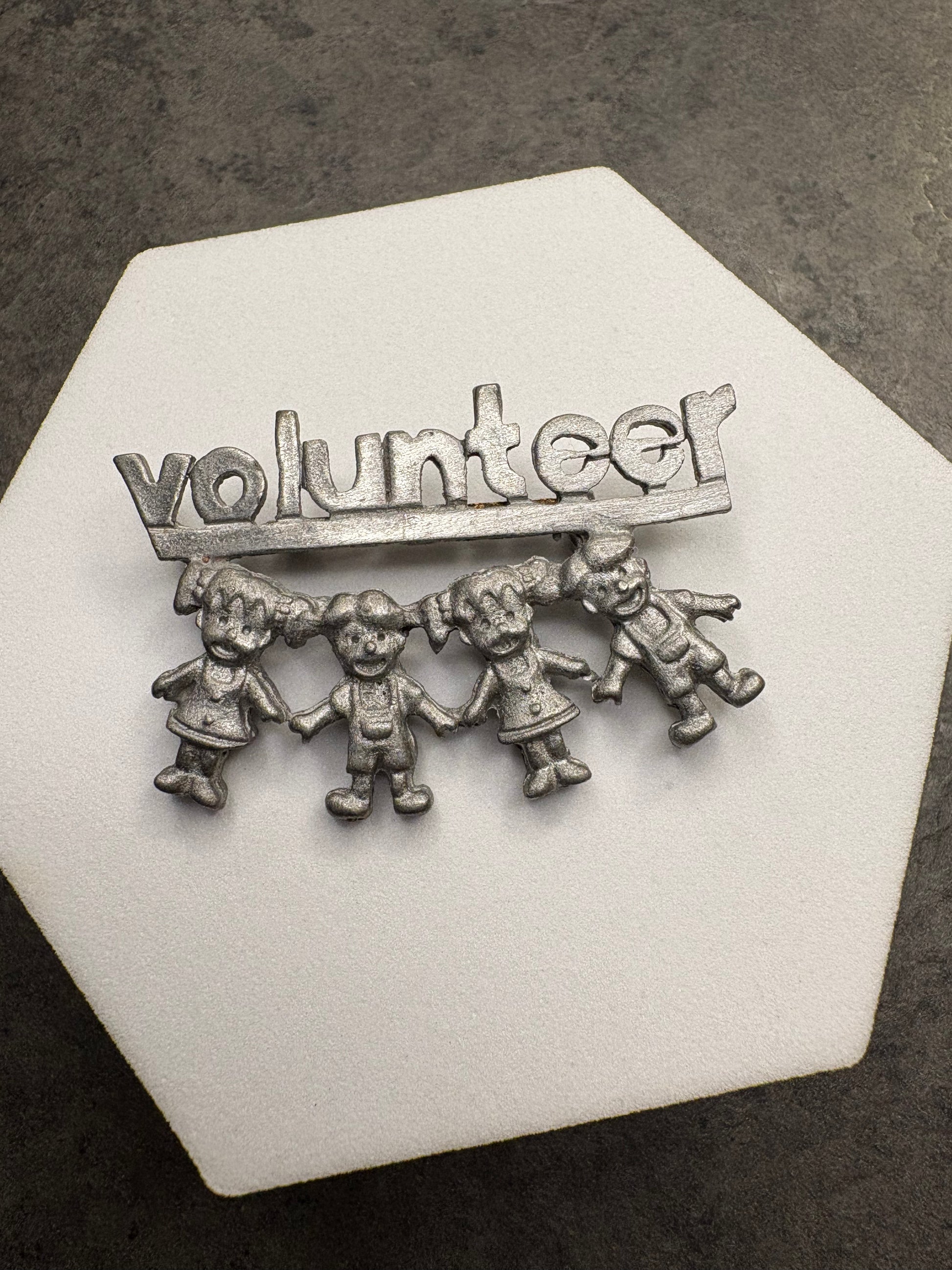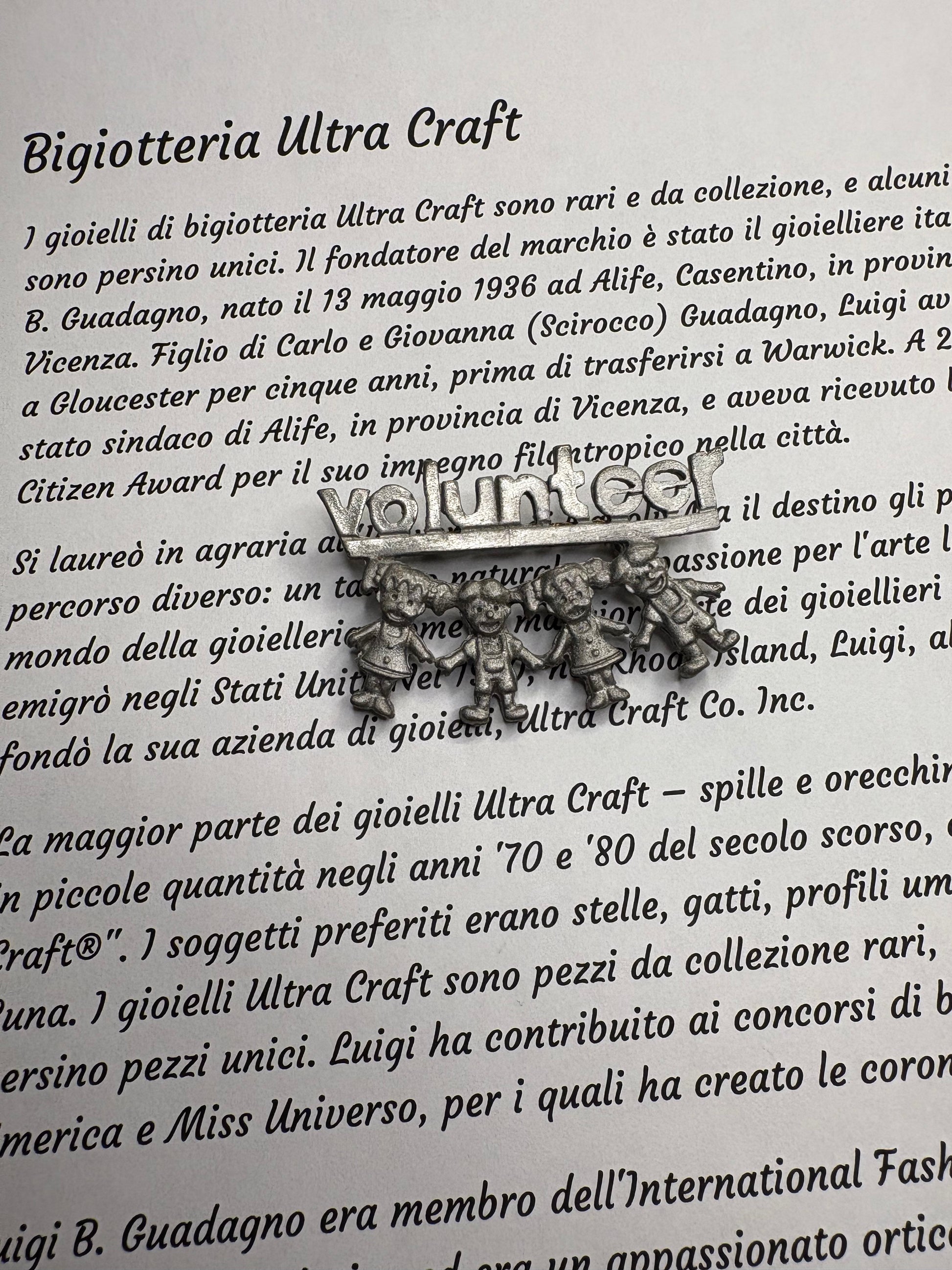 Questa spilla dal forte valore simbolico è firmata Ultra Craft, noto produttore americano attivo soprattutto dagli anni ’40 agli anni ’70. Realizzata in metallo color argento, raffigura la scritta “Volunteer” sostenuta da una fila di bambini stilizzati che si tengono per mano, evocando solidarietà, impegno sociale e spirito comunitario. Il design è semplice ma espressivo, con una lavorazione leggermente satinata che dona profondità alla superficie. Un pezzo dal grande significato storico e collezionistico.