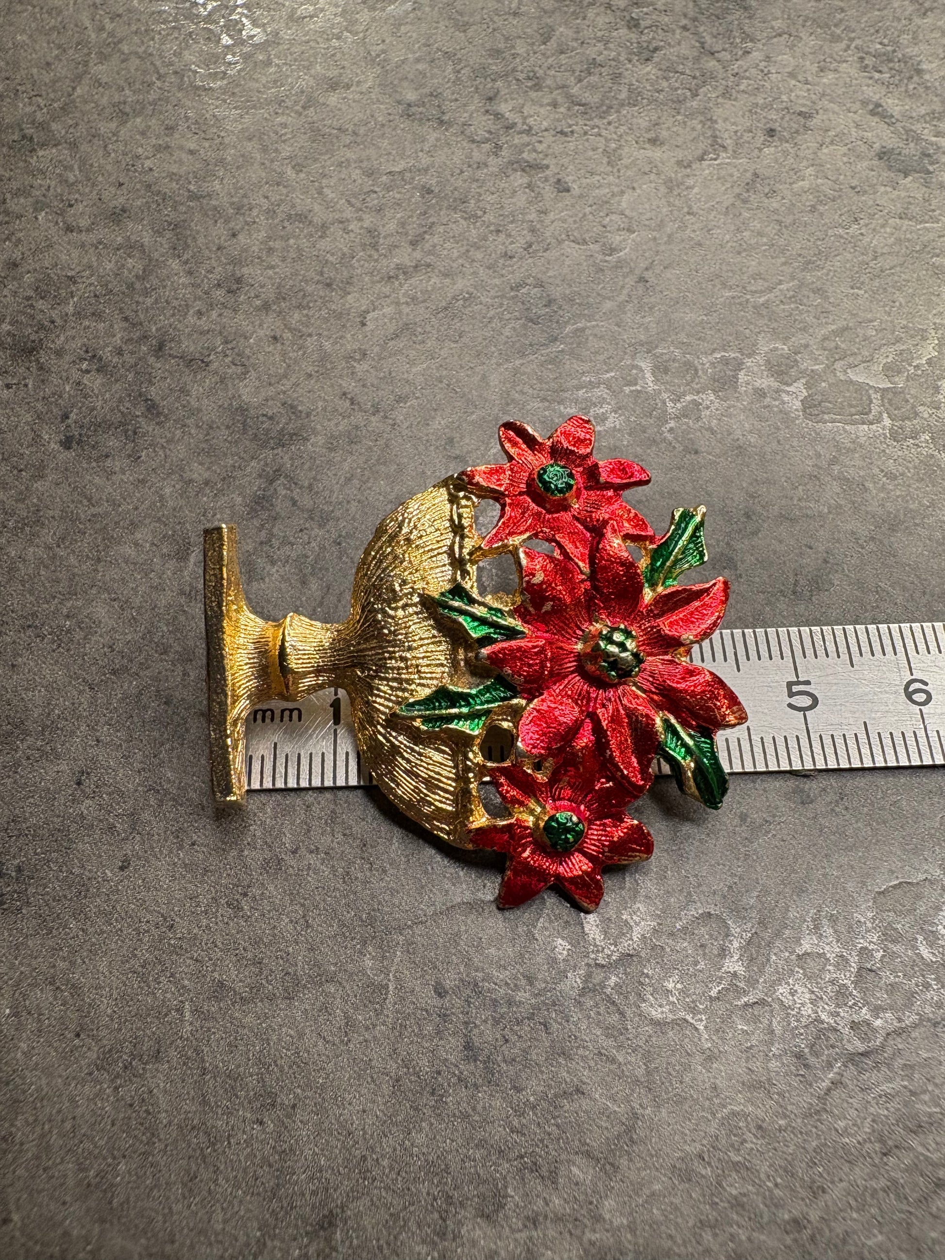 Deliziosa spilla natalizia vintage raffigurante un elegante vaso dorato colmo di stelle di Natale rosse, simbolo per eccellenza delle festività.