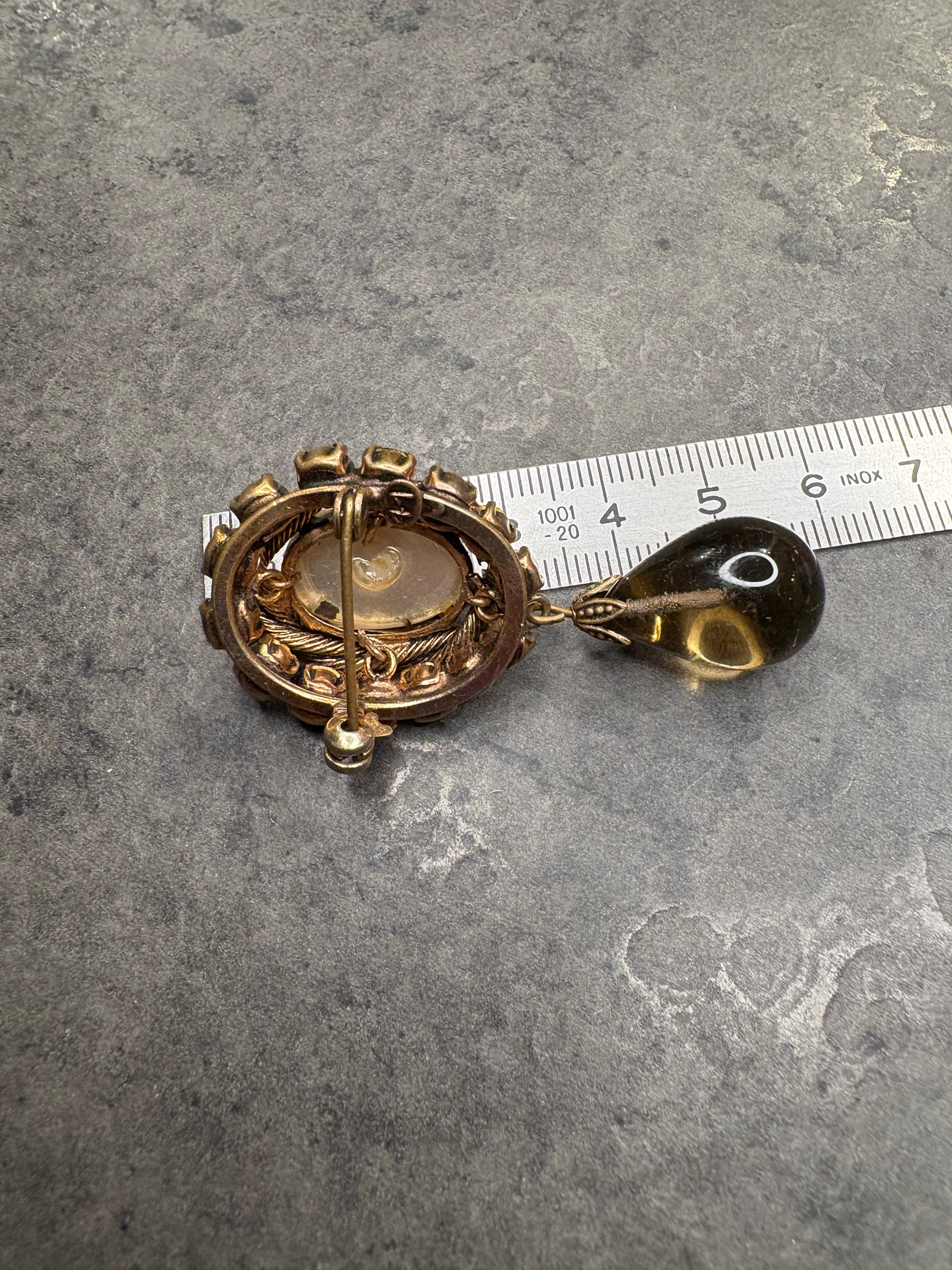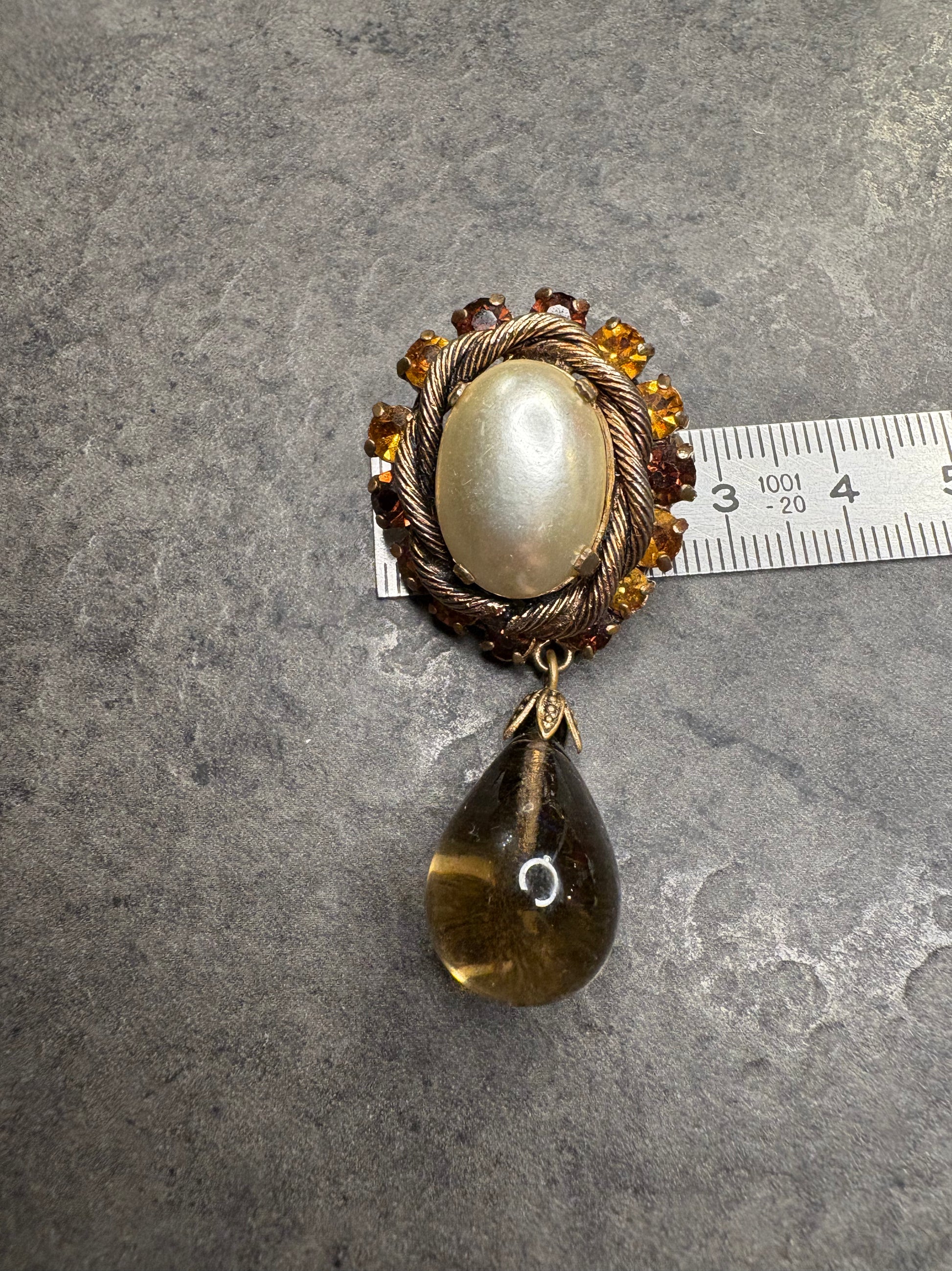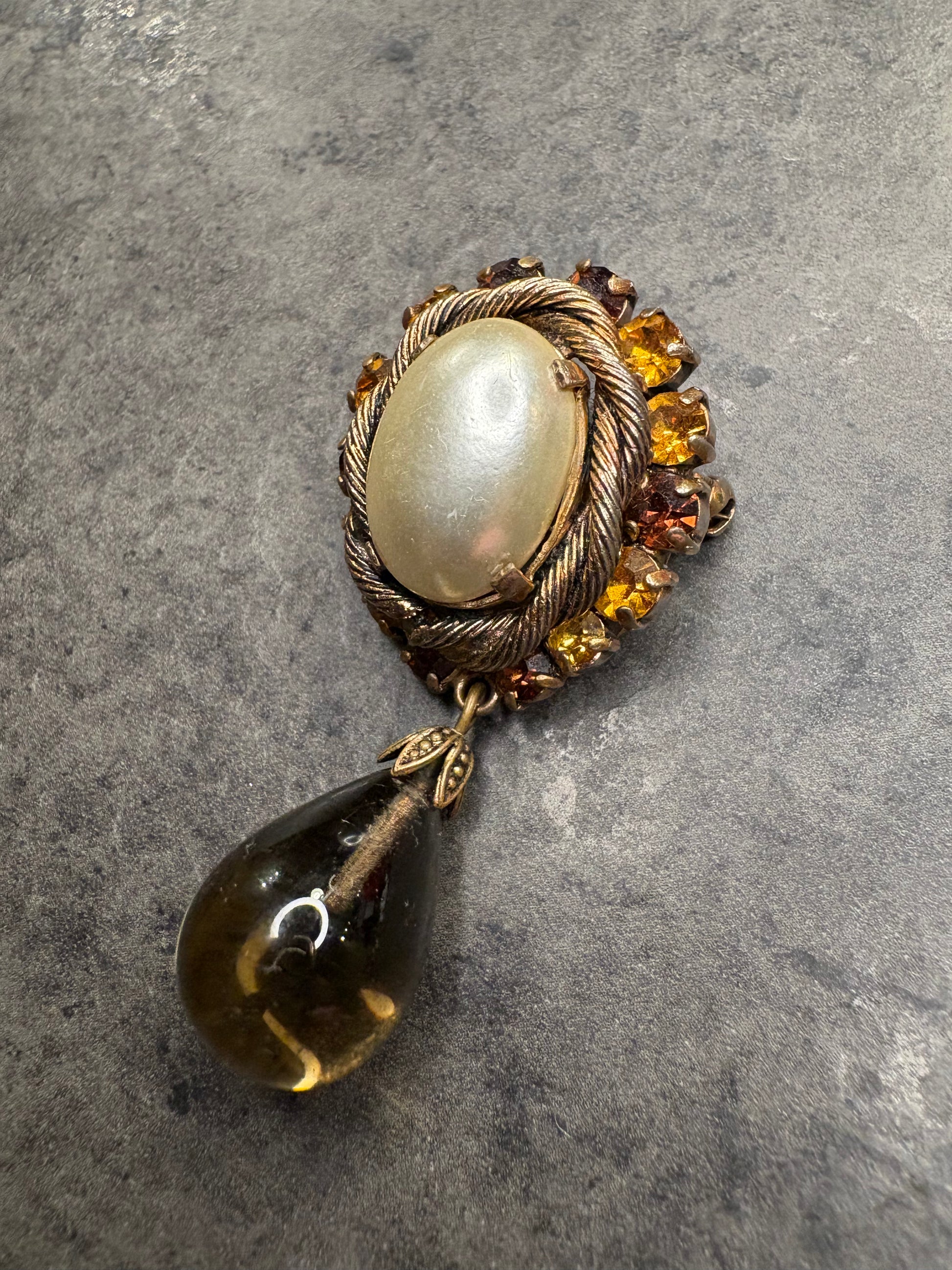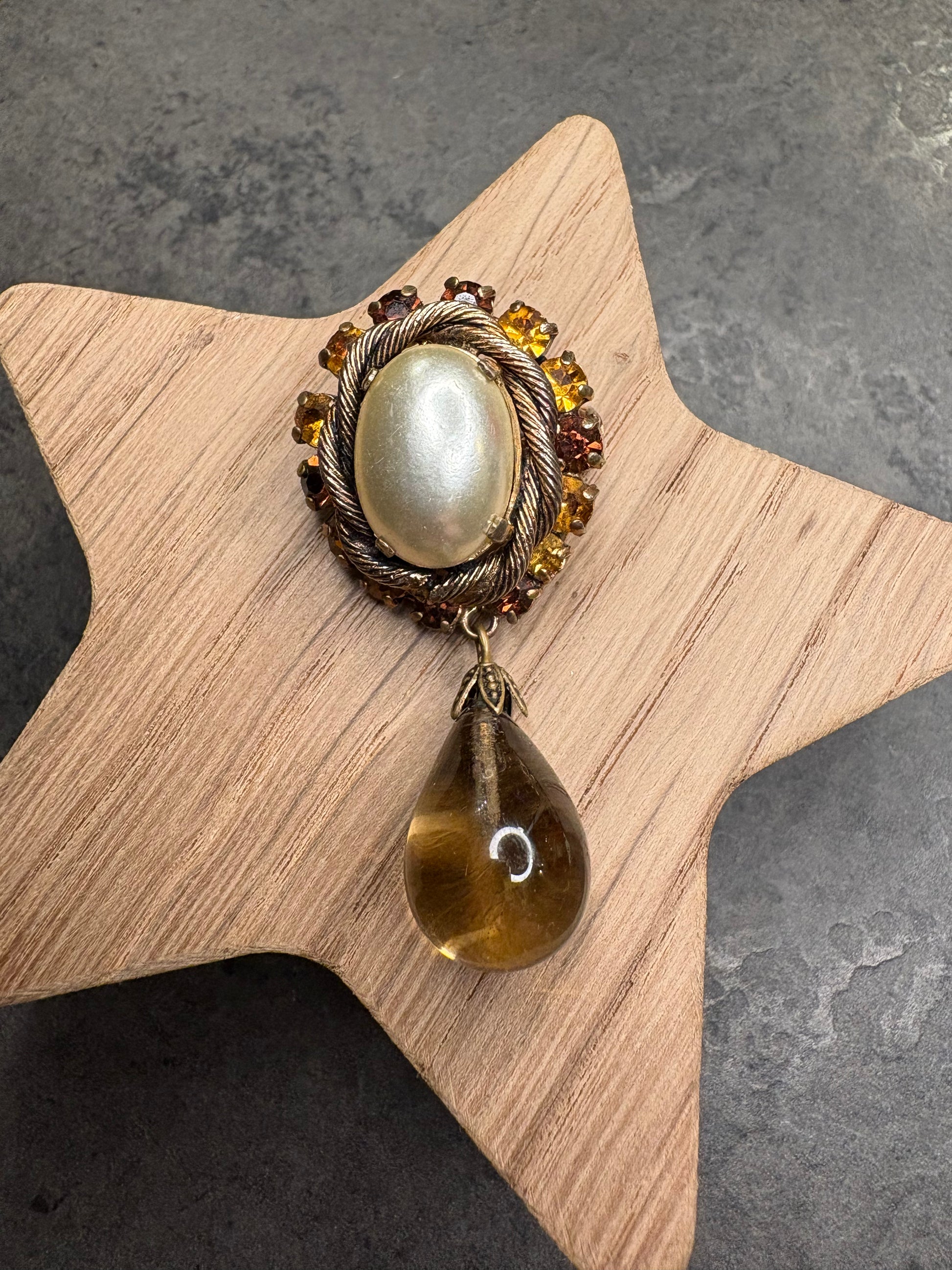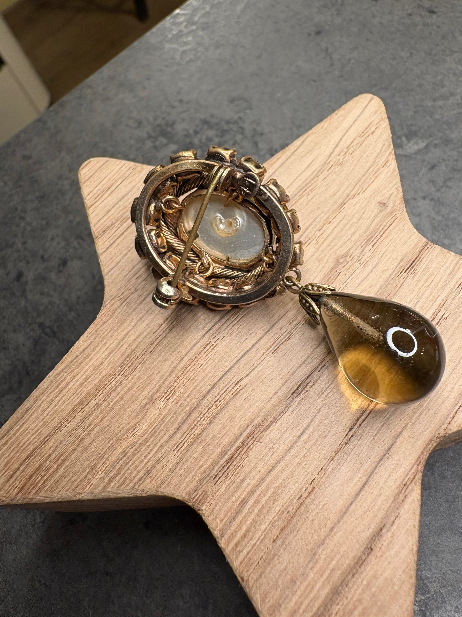 Al centro presenta un grande cabochon ovale di plastica perlata che dà un tocco morbido e luminoso. Intorno al cabochon è incastonata una cornice testurizzata a forma di corda intrecciata che aggiunge un effetto tridimensionale e vintage. La parte superiore è decorata con cristalli sfaccettati in tonalità ambrate: marroni chiari e alcuni più scuri, disposti in modo asimmetrico per creare movimento e brillantezza. Dal basso pende un elemento dangle a forma di goccia in vetro fumé marrone-dorato (simile a smoky quartz o quarzo affumicato), lucido e trasparente, che dà alla spilla un piacevole movimento quando indossata.