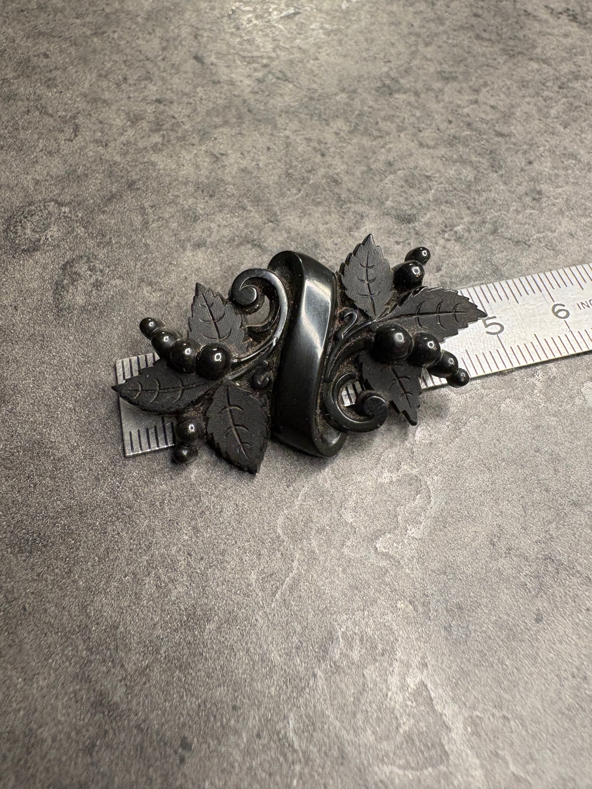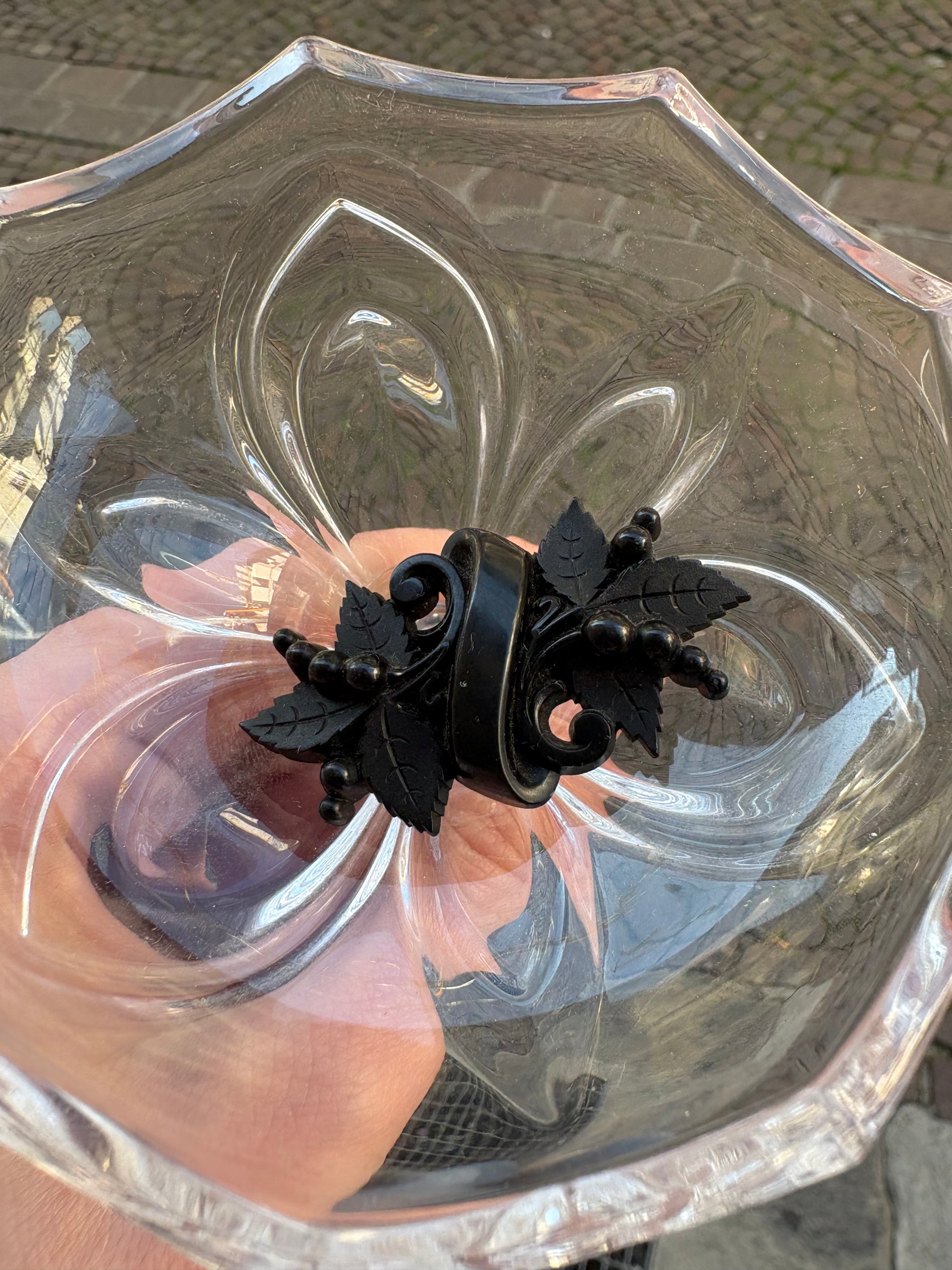 Il design presenta un raffinato motivo vegetale con foglie e bacche scolpite a mano, unite da un elegante decoro centrale a volute. La lavorazione minuziosa mette in risalto il tipico contrasto del giaietto: la superficie lucida e levigata si alterna a dettagli più opachi e materici.