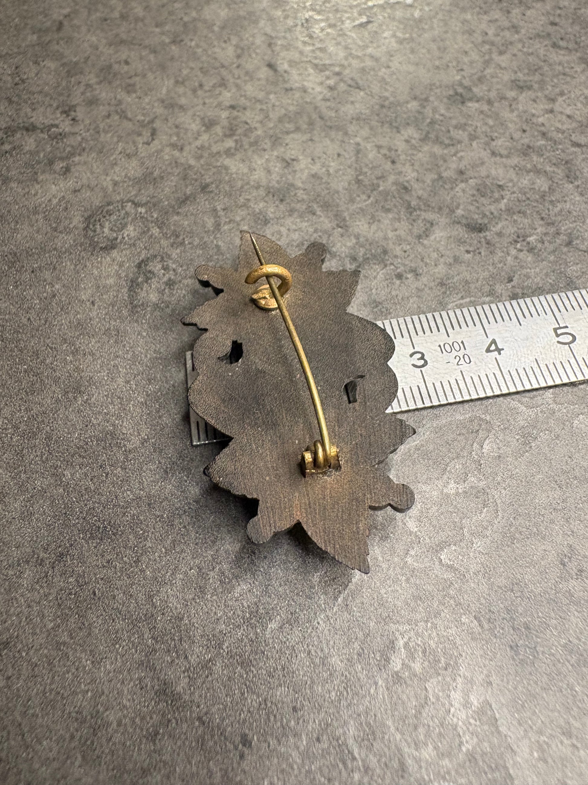 Il retro mostra la classica montatura in ottone con ago e chiusura semplice, tipica delle spille vittoriane originali.