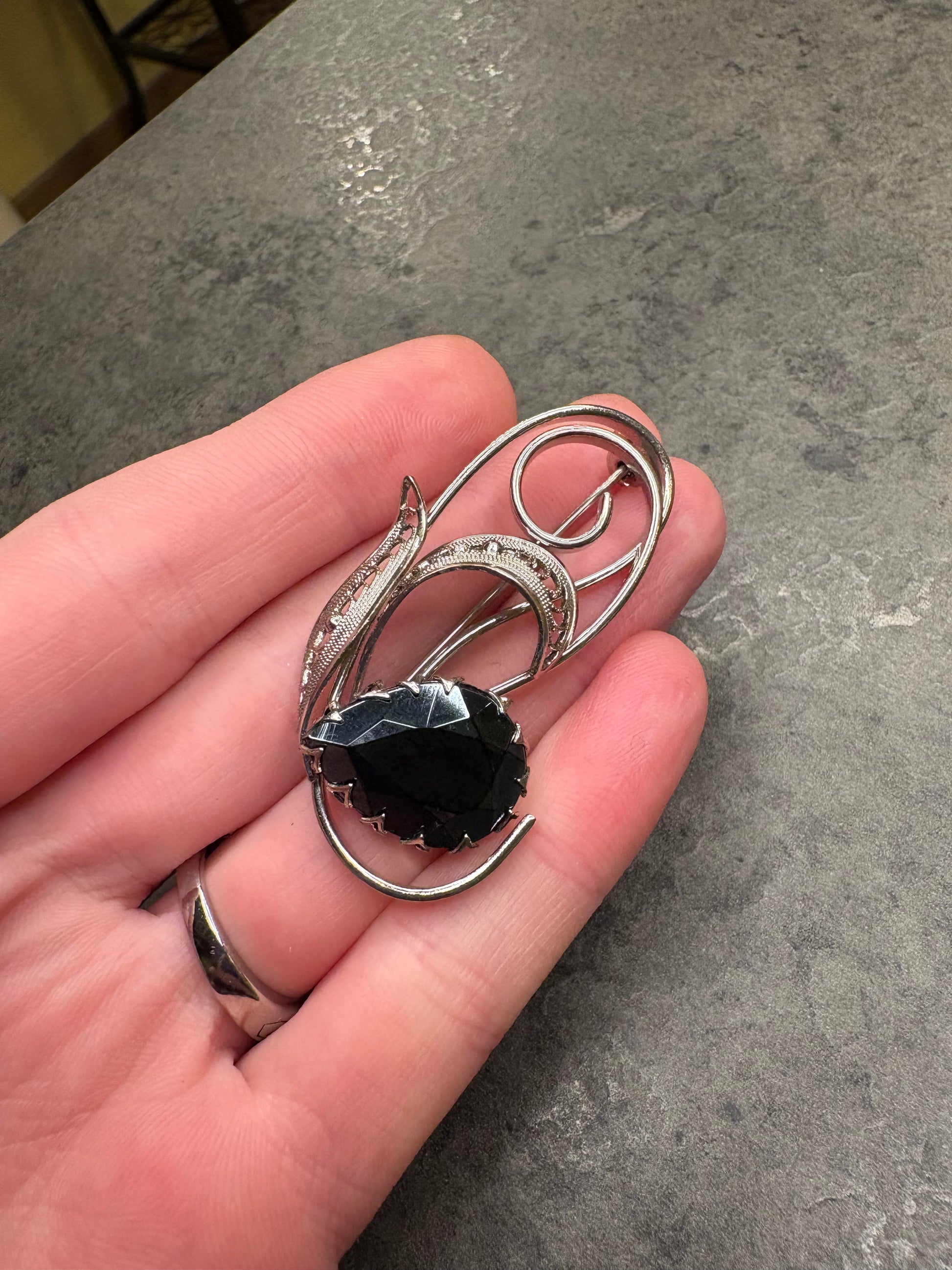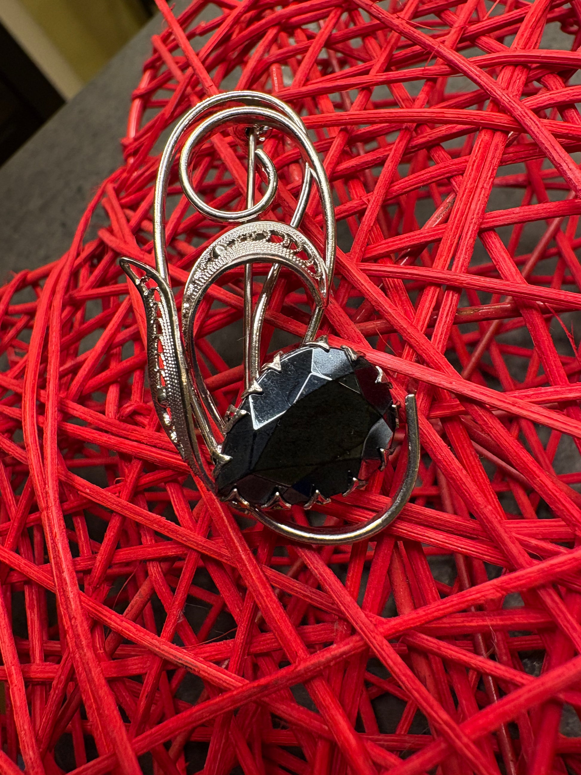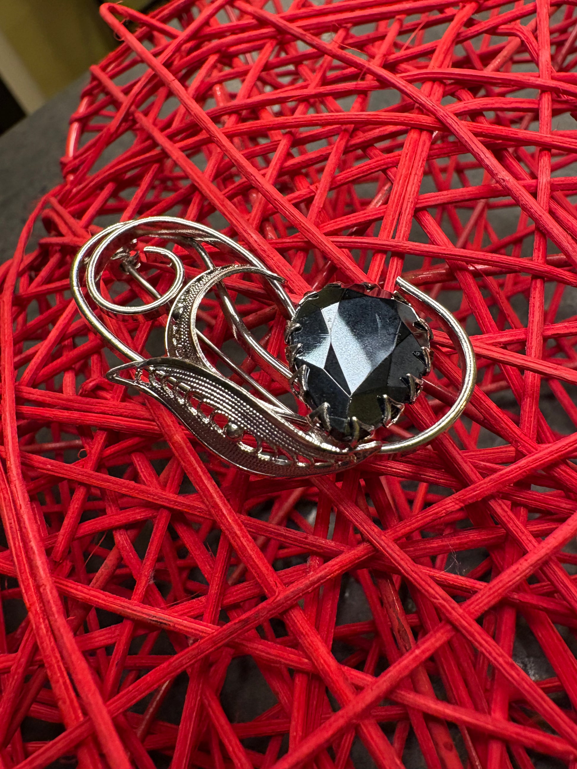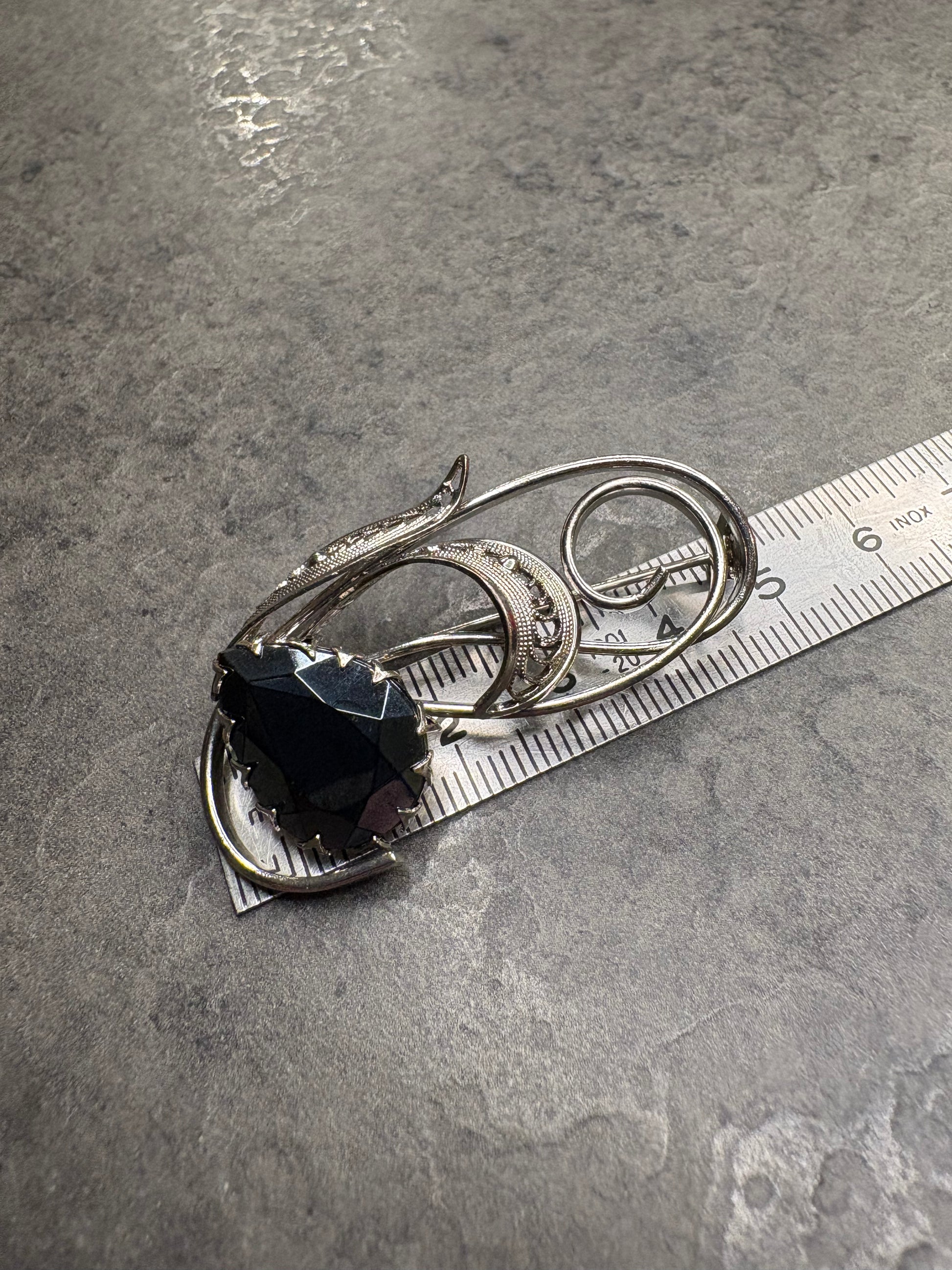 La struttura in metallo argentato presenta linee sinuose e fluide, tipiche dello stile romantico e decorativo dell’epoca. La parte centrale è impreziosita da una grande pietra nera sfaccettata, tagliata a goccia, che dona profondità e un contrasto elegante con il metallo lucido.