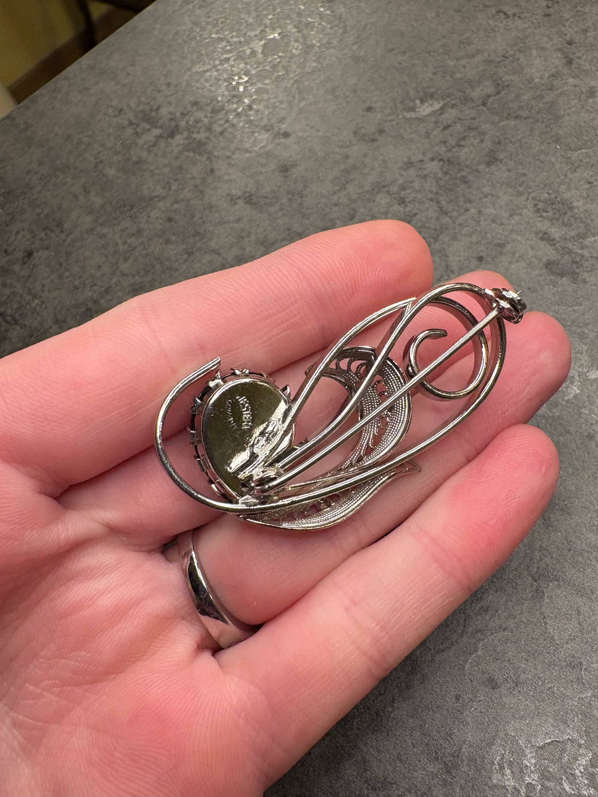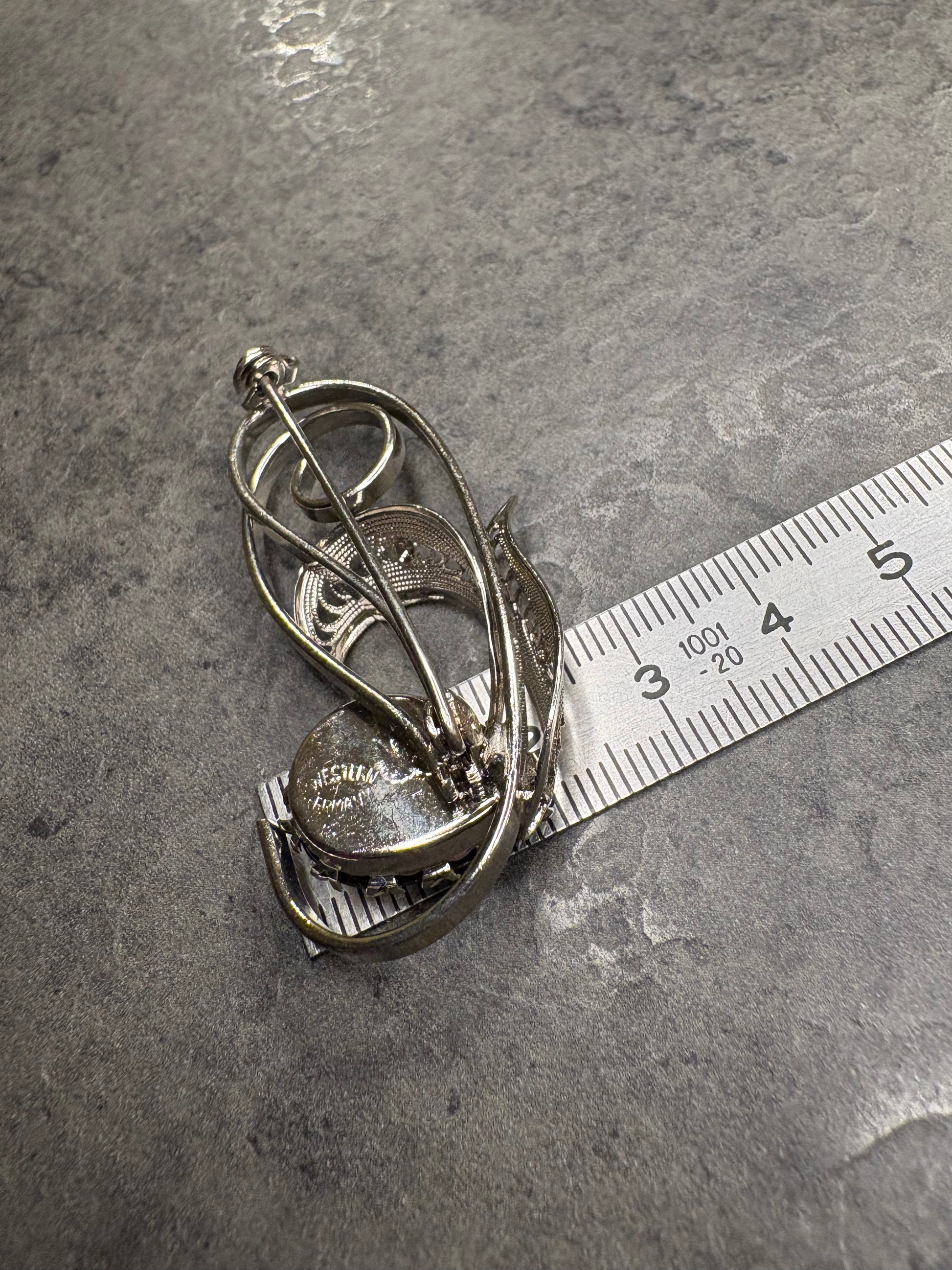 L’intreccio traforato, visibile anche sul retro, rivela una minuziosa lavorazione filigranata che rende la spilla un piccolo capolavoro artigianale. Sul retro è presente la marcatura “Western Germany”, segno distintivo dei gioielli realizzati nel periodo postbellico, oggi molto ricercati dai collezionisti per la loro qualità e rarità.